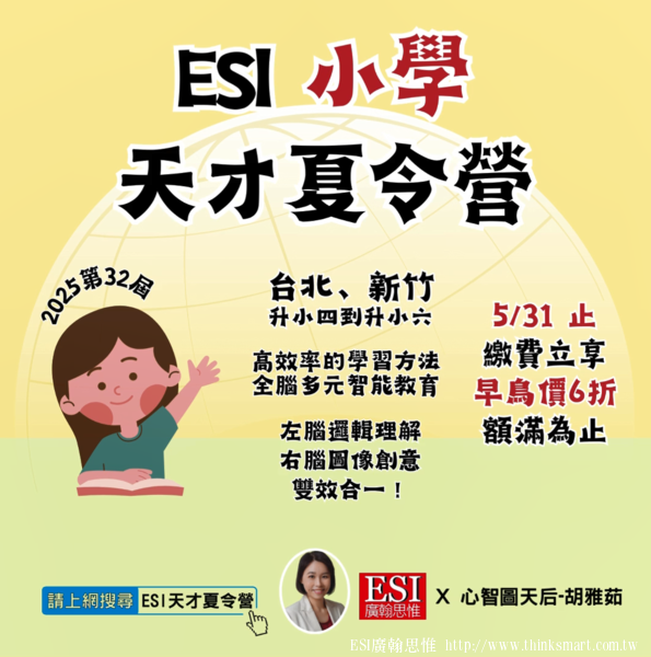 #2025夏令營 #兒童夏令營 #小學夏令營 #暑假夏令營 #圖像記憶法 #超強快速記憶訓練 #心智圖訓練 #ESI廣翰思惟 #心智圖天后 #胡雅茹 #ESI小學天才夏令營 #讀書方法 #學習方法 #讀書高手 #學習高手 #考試高手 |