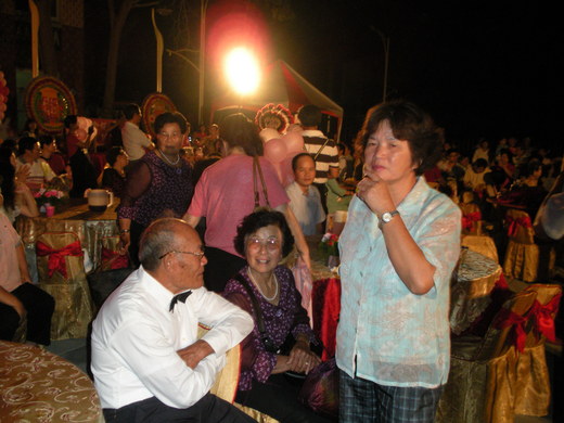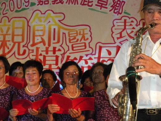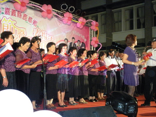 2009年,阿嬤103歲,獲選為鹿草鄉竹山村的模範母親。 台上唱歌這群人,年紀最大有85歲,最年輕的也有64歲。是鄉裡歌唱班的基本成員。 這些阿公、阿婆,手上拿著歌詞,努力的唱著歌。其實啊,手上那張本歌詞是裝樣子的,他們很多人一輩子沒進過一天學堂,不識半個大字。 雖然如此,年輕時,媽媽作裁縫、後來賣魚,加減乘除可是一點都不含糊。------不識字的媽媽怎麼唱歌?唸過小學的爸爸一句一句的教,媽媽一句一句的背,就這麼唱起來了。 下圖畫面中央那個最可愛的,就是我親愛的媽咪。 最下圖中戴著可愛領結的,是我父親。他本來也是要上台的,可是手的抖動愈來愈厲害,他就不肯上去了。右邊那個美女是我大姊(堂大姊,家族中的大姊大),後面穿和媽媽同色一幅的是大姑媽,背對鏡頭的也是堂姐(中和佳欣水族館的老闆娘),右邊那個額頭發亮的是堂哥。