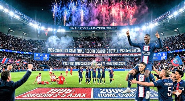歐冠強強過招創四強最高5比4比數誰不叫好 相關連結樂聯網全文分享請點入:https://leho.com.tw/archives/295776 不用多說每個球迷都會為這樣的比賽叫好!2026年4月29日歐冠準決賽一場不可思議的5比4,巴黎聖日爾曼主場擊敗拜仁慕尼黑,此役創造了歐冠改制以來四強準決賽的最大比數紀錄,這也是拜仁隊史第二次在歐冠單場丟掉5球,上一次還要追溯到遙遠的1995年,當時他們在準決賽次回合2比5輸給阿傑士,至於大巴黎,他們自2006年來首次在正式比賽中主場被對手攻入4球。外媒甚至形容「這場已經超越了足球賽場的巔峰對決,更像是兩支約好不尋求功利的球隊集體書寫的足球傳奇。」