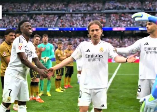 莫德里奇被換下完成伯納烏告別戰一刻,雙方球員列隊送他光榮退場。(取自ESP社媒) (「笑傲足球部落報」FB發行人龔義三及社長何長發與「樂聯網」連結,在此「龍來共發」抓住時事分享國內外足球評論讓您掌握全球視角:)