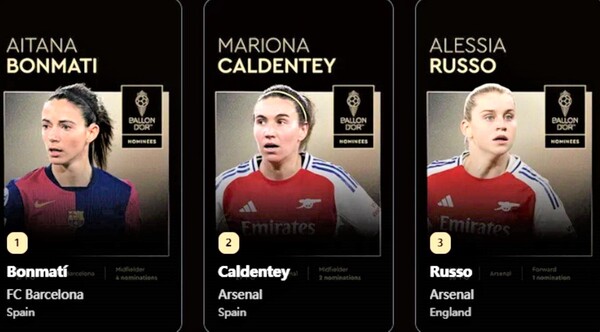 圖說:2025年女足金球獎前三名左起邦馬媞、卡兒登太和奴索。(取自UEFA社媒) (「笑傲足球部落報」FB發行人龔義三及社長何長發與「樂聯網」連結,在此「龍來共發」抓住時事分享國內外足球評論讓您掌握全球視角:) 相關連結樂聯網請點入:https://leho.com.tw/archives/192498 剛出爐的2025年「女足金球獎」評選中,巴塞隆納西班牙女國腳邦馬媞(Bonmati)力壓西班牙卡兒登太(Caldente)與英格蘭奴索(Rousso),實現了女足金球獎「三連莊」偉業。然而邦馬媞這次連莊卻引起了爭議,尤其英國球迷更是為奴索抱不平。此爭議直接反映在奴索獲得贏得今年女足歐洲國家標賽以及歐冠聯賽並不保證就是金球獎女王,而邦馬媞的連莊似乎表明了「個人表現比團隊成績佔據更高權重」!