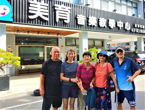 2022年9月5日帶妻小再遊花蓮探訪老友善伍賢伉儷在美育教室合影。 最近一次與老虎一家在花蓮相聚,是2022年秋天,我們去參觀他們擴開新店面的「美育音樂教學中心」,同時把我寫的臺體傳奇教授陳定雄「悲壯美人生」一書致贈給老虎。謝夫人淑霞專攻鋼琴為主音樂教學,在花蓮經營得有聲有色,並且培育出自己的兒女亞倫與亞潔也專攻音樂有成,如今,都回來幫忙媽媽開展在地的音樂推廣事業。