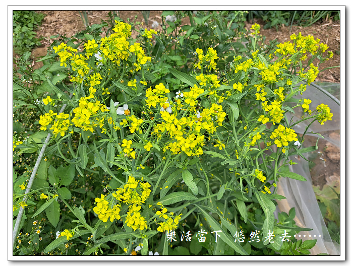 2024年年底種了二十株包心芥菜,到了2025年2月底採收完畢,二十株包心芥菜中有二株長得不好就沒有摘,打算留著讓它開花採收種子。到了4月初芥菜開花了,花朵雖然小但金黃色卻頗為亮麗,為了讓花能得到昆蟲的幫忙授粉,將架在芥菜花外的防蟲網去除。