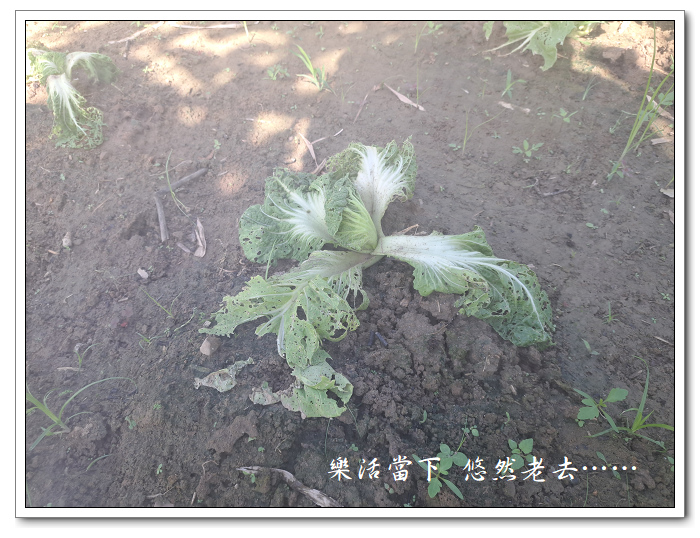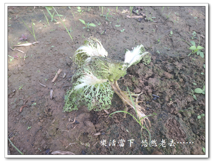 有一株芥菜被蟲啃食得很嚴重,加上懷疑好像感染了蚜蟲,索性將它拔除。拔下後確定是沒有蚜蟲,但長成這個樣子大概也沒什麼指望,而其它幾株也好不到哪裡去,所以這些芥菜決定放棄,網購的網子賣家標示已出貨,但等了又等卻不見送達物流的進一步消息,沒有防蟲網就不敢貿然再種,等防蟲網到了之後再來重新種植。