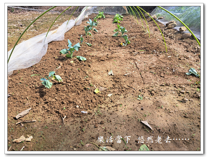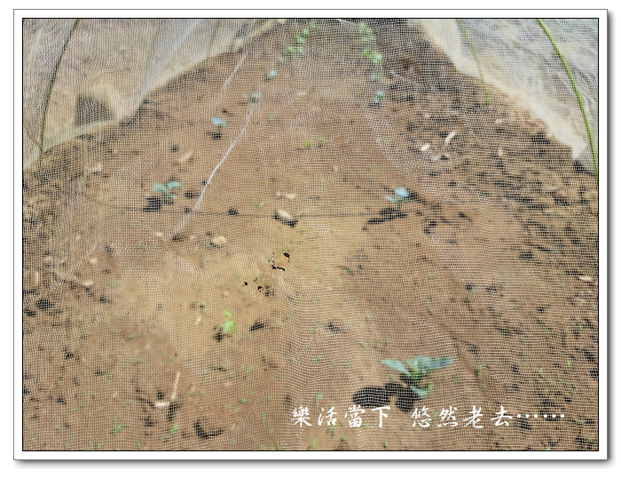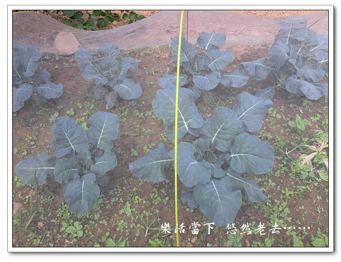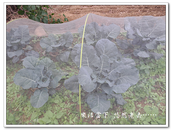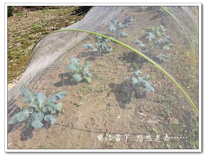 種了高麗菜後偶爾就會看到紋白蝶來,但有防蟲網所以牠無法在菜上產卵,在網子外飛一飛後就離開,青花菜同樣是十字花科植物,所以種下後隨即將防蟲網架上,防止紋白蝶來下蛋。