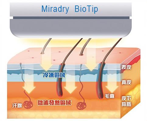 微波發熱區域包含一般汗腺及狐臭頂漿汗腺,miraDry以微波熱能止汗的治療方式,利用安全且非侵入性的方式來破壞腋下的汗腺,透過電的磁性性能反射,將分布於真皮層與脂肪的交接處汗腺進行針對性的精準破壞。同時也利用冷卻系統來保護表皮及真皮上部等其他腋下皮膚組織,保護皮膚不會被灼傷,被破壞的腋下汗腺不會再新生,對於治療腋下出汗、腋下多汗症,治療滿意度高達90%。 使用微波治療多汗異味的好處: