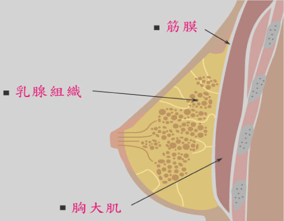 位於乳腺組織後方一層厚度極薄的結締組織;所謂筋膜下放置