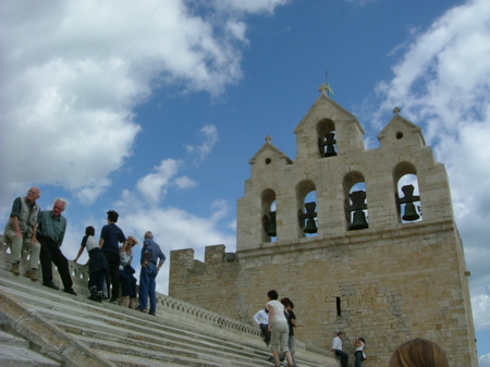 Saites-Maries-de-la-Mer 是本區觀光活動的大本營,小小的鎮上遊人如織,大家擠在紀念品商店購買本區特產,逛累了就坐在路邊咖啡店歇歇腳,看著廣場上穿著汗衫短褲拖鞋的老伯們玩滾球,我到法國很多次了,第一次看到有人這樣穿,真是太親切了。 若是沒有懼高症的,可以考慮登上教堂的屋頂,會發現這是個充滿西班牙南部安達露西亞風味的小鎮,白花花的陽光映著刷得亮白的牆壁,不遠處的地中海,波光瀲艷,這個教堂還可以爬到蓋著瓦片的屋頂上,老實說,還真斜,不曉得有沒有人從上頭滾下來?我是看著許多六七十歲的老先生老太太都爬上去了,才硬著頭皮也跟上去,不過,風景真好,聽著底下傳來的聖歌,真感覺自己離天堂不遠。 |