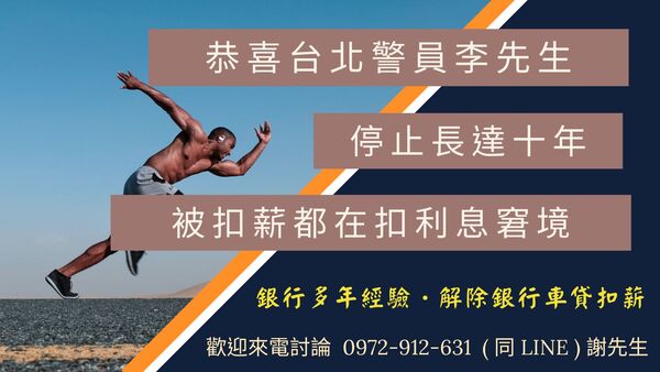 賀!台北警員李先生成功解除銀行及資產公司強制扣薪,停止長達十年每月被扣薪二萬都只是在扣利息窘境,李先生非常感謝我們解決這個人生中最大的難題。