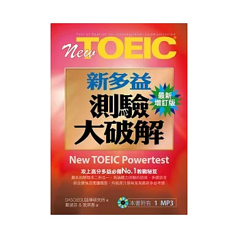本書為新版TOEIC測驗第一本Official Guide。為了提供讀者正確的資訊,書中的TOEIC測驗簡介部份提供新、舊TOEIC測驗的內容比較,並以範例解說新版試題型態。本書包含了兩份新版 TOEIC練習測驗(共400題),內容均依照ETS製作的新版試題標準型態編寫,CD內收錄的聲音亦完全比照正式測驗規格,對於考生而言,是準備考試的 有效練習工具。