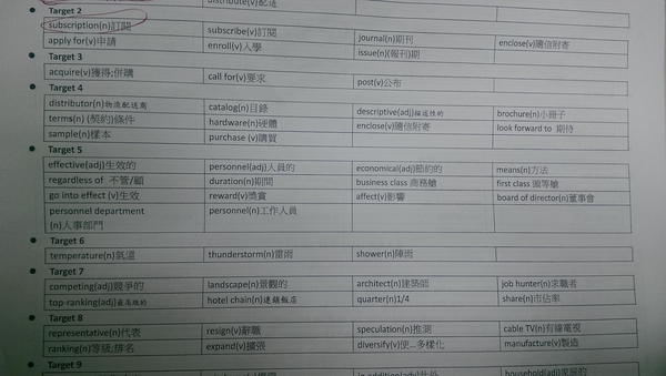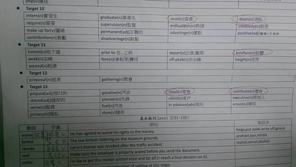我另外還加上補習班多益TOEIC老師上課補充的多益TOEIC單字講義,不熟的字我就用紅筆圈起來。考前衝刺拿來翻,紅筆註記的單字多看幾遍,嘴巴更要念出來,切記發音、意思、拼字,三者要同時連結。