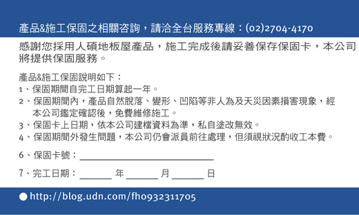 木地板的保固對消費者來說,是提供施作後的品質保證與售後服務。過去消費者常碰到裝潢施作完後,就找不到廠商來處理了。所以找一家品質信譽良好,與能題供完工後的保固與售後服務的廠商就很重要。 一般木地板的保固可以分為兩部份來談: 1.木地板商品的保固 有些歐美木地板的代理商公司,有提供15年的原廠商品保固,這部份指的是木地板商品的保固,並不包括施工上的保固,且大多數為超耐磨木地板,保固的條款大多為"陽光或人照光下不會褪色及失去光澤‧無穿透、破裂‧當有製造瑕疵時不收費........等."。 而市場上海島型與實木地板大多無法提到15年以上產品上的保固 2.木地板施工的保固(責任施工) 施工上的保固對消費者來說相對重要,因為一但發生問題,還是要找當初施工的師父來處理,製造或進口的木地板公司並不會負施工上的責任。所以找一家有信譽,且願意提供施工後的施工保固的公司,是很重要的,千萬別為了省了一些小錢而造成日後的大困擾。 ◎消費者本身的木地板保養 不過消費者自己本身,也是要依照正確的方式來保養木地板,這就像汽車原廠提供保固,但車主也要正確操作與定期保養一樣的情況。目前在市場上並沒有任何一家木地板廠商,願意提供無任何條件下的,無嘗保固的。(如果有可能也只是口頭隨意說說,無實際保障) 木地板保養方式參看:http://blog.udn.com/fh0932311705/3090013 我们的專業團隊,對於施作的個案,不論個案大小皆提供一年期產品&施工上的保固,並核發保固卡(非口頭說說而已),不用擔心有狀況找不到師父來處理。 ※如遇到相關問題歡迎E-mail:kk51157.chen@msa.hinet.net 給我或來電 02-23120098詢問