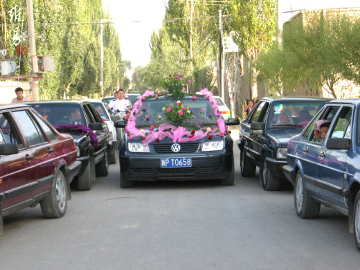 鏡頭現場:新疆阿圖什市 在漫長的旅途中如有巧遇,它帶來的驚豔比旅程本身更迷人,也更難忘懷。今夏的新疆行,在南部阿圖什市的一個午后,就有這樣一場美麗的邂逅。 參觀完了「蘇里唐‧薩圖克‧波格拉汗麻札」(麻札:墓地),突然一陣鑼鼓喧天,只見一輛妝點著鮮花和纏繞粉紅緞帶的禮車,夾在車隊中緩緩前行。呵呵,原來是娶新娘呀!本以為維吾爾族結婚是坐馬車搞浪漫的,怎知是坐著有空調的VW轎車。 維族婚禮通常大清早就揭開序曲,先舉行叫「尼卡」的伊斯蘭教儀式。下午才是重頭戲,新郎迎娶新娘返家途中,是結婚儀式的最高潮。開道車是載滿陪新郎迎親的帥哥們,他們擠在小卡車上,打著手鼓、彈著「獨塔爾」(維吾爾族的民族樂器)、唱著婚禮的喜歌。而新郎和新娘分別乘座兩輛汽車於後,還沒入洞房就搞分「車」,為何兩人不坐同一輛車,我百思不得其解。 按照他們的傳統習俗,要繞整個村子『遊街示眾』,來昭告天下。而且鄉親們還可半路『打劫』,此時新郎必須要向大家鞠躬哈腰的謝禮,並發喜糖給小朋友,所有的人立即跳舞回禮。我們也興奮的隨著音樂節拍,與他們一同唱著跳著,並真心地祝賀這對新人永浴愛河、白頭偕老。 【刊登於 |
