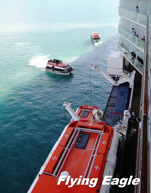 ▲接駁船紛紛回到遊輪。