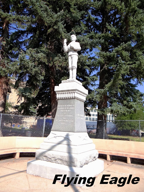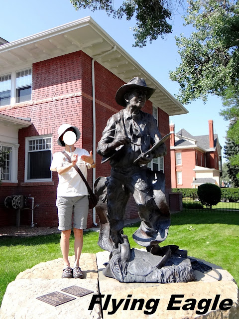我們在州府前閒逛,發現綠油油的草地上,有不少白色的東西。仔細一瞧,原來是野生的菇蕈呢!很好奇這些野菇是否可以食用。附近還有兩座雕像,其中之一是當地著名的牛仔藝術家高林斯(Bill Gollings)。銅雕身穿牛仔服,手持調色盤,彷彿正在作畫。另一座則是西美戰爭紀念碑,紀念西班牙和美國在爭奪美洲領土時喪生的將士。我們走訪了40多個州府,見到的雕像多是政界名人,懷俄明州倒是與眾不同。 ▲草地上白白的是什麼? ▲是野菇啦! ▲牛仔藝術家的雕像。