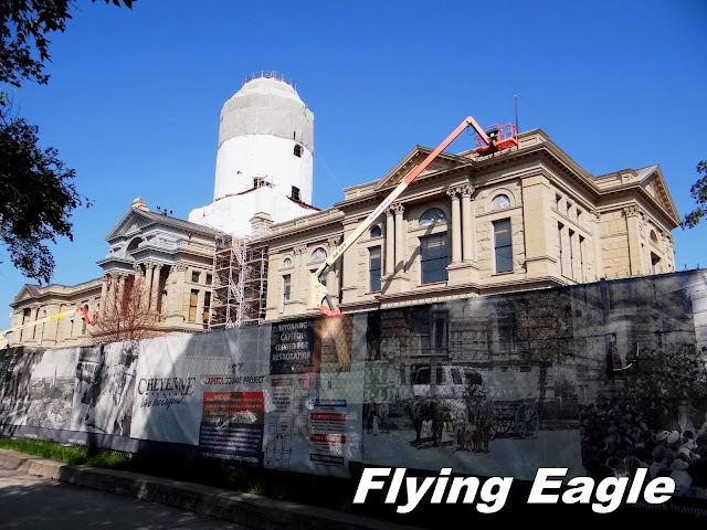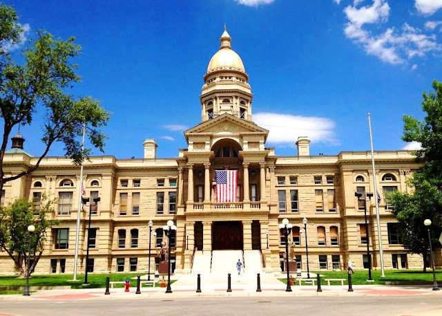 懷俄明州位於美國西北部,幅員遼闊,人口稀少。全州人口不及60萬人,比其他州的大城市還少,為全美人口總數最少的一州。州內印第安原住民的比例相當高,州名便來自印第安語,意即大草原。首府夏安則是印第安部落的名字,它亦是州內第一大城。一般人對該州的印象多半和黃石國家公園(Yellowstone National Park)相關,但其實除了黃石,該州還有大提頓國家公園(Grand Teton National Park)和魔鬼塔國家紀念區(Devils Tower National Monument)兩個世界級的名勝,每年吸引大量遊客前往。下篇將開始介紹黃石和其他位於大西北地區的自然風光。 座落於夏安市區的州府,於1890年落成,迄今已逾百年。我們到訪時不巧正在大興土木,不但無法進入,而且圓頂的部分完全被包覆,模樣像個水塔。從外露的部分,看到樑柱頂端都有精緻的雕飾。 ▲州府正在修繕中無從進入。 ▲從外露的部分看到樑柱上的雕刻。 ▲州府原本的樣貌(from Internet)。