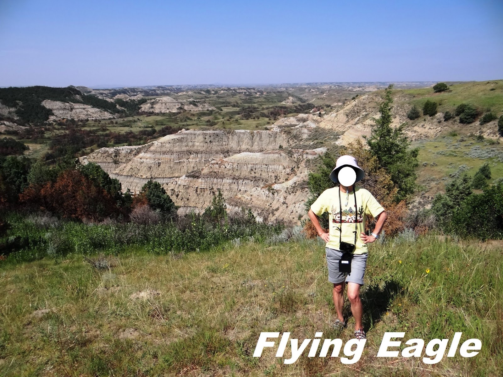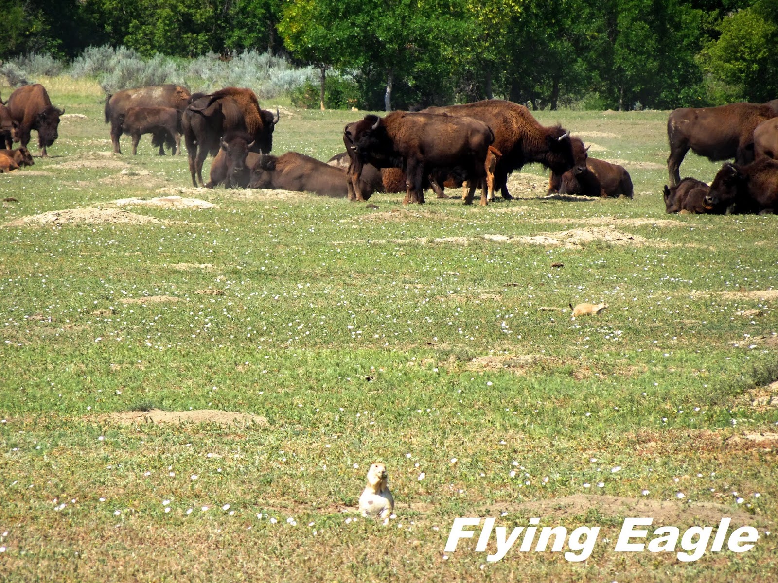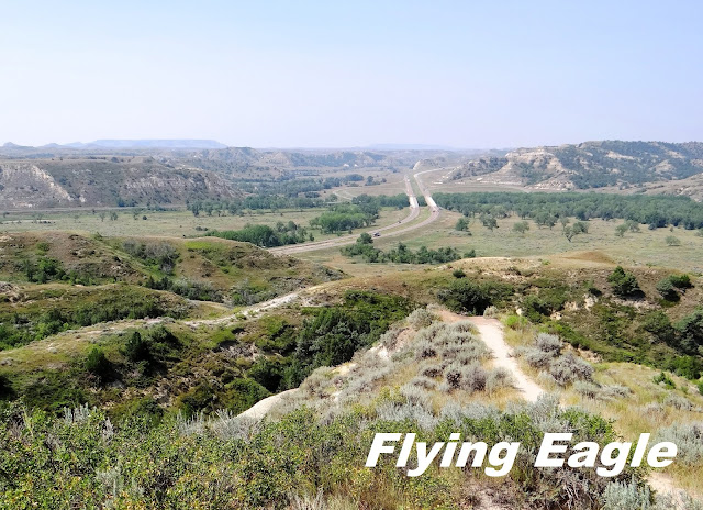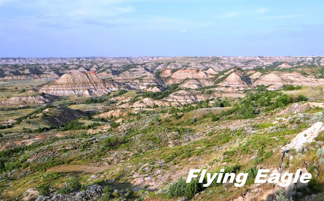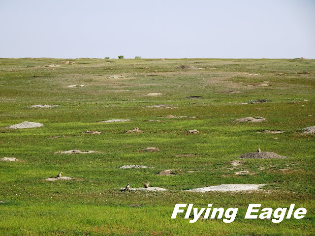 翌日早上我們走訪南區,沿著36 哩長的Scenic Loop Drive瀏覽風光。首先看到的是土撥鼠城(Prairie dog town),只見大片的草原上有著數不清的小土堆,而不少土堆上都有土撥鼠站著,彷彿在固守城池。其實北區和南區都有土撥鼠城,但南區的範圍較廣,可看性亦較高。我們拍到兩隻肥嘟嘟的土撥鼠哥倆好,一前一後站著,後者把手搭在前者的背上,可愛極了! 繼續前行,在波伊寇特眺望點(Boicourt Overlook)聚集了十來位遊客圍觀,原來遠望有大批美洲野牛成群結隊。我們往前再走一段路便到該批野牛所在之處,近距離觀察。牠們雖然安靜吃草,但粗壯的體型動輒揚起沙塵。而在壯碩的野牛群前,竟然有小小的土撥鼠在忙碌穿梭,大與小的對比形成有趣的畫面。天際遠景(Skyline Vista)有條長僅0.2哩(320公尺)的步道,簡單易走,可以俯瞰小密蘇里河和往來公園的要道94號公路。