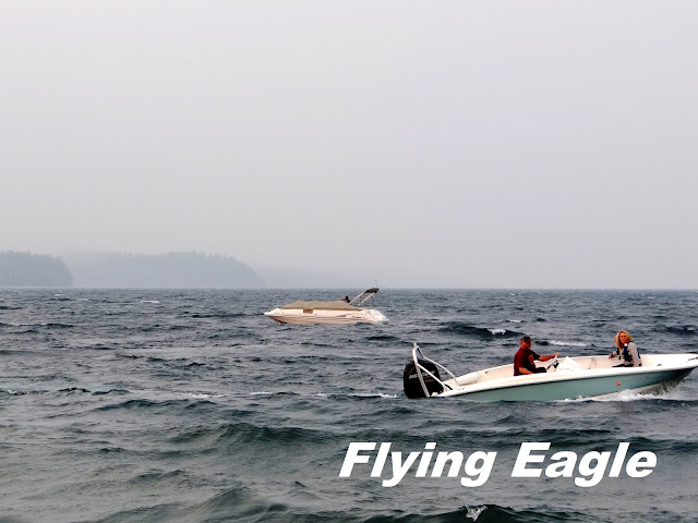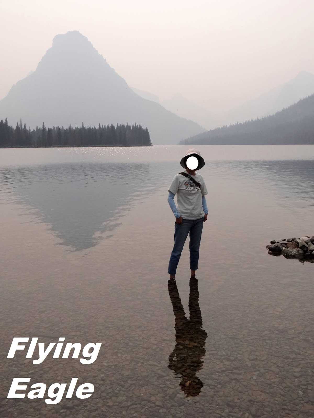 ▲長得像手掌又像凳子的樹。 ▲眾冰河飯店已逾百年歷史。 雙藥區(Two Medicine)位於公園東南,面積不大。雙藥這名字有點奇怪,據說來自兩棟隔溪而立的作法屋(medicine lodge),也就是印第安人驅逐病魔或其他儀式用的房屋。這一區雖然離森林火災有段距離,景致仍舊迷濛,彷彿置身黑白電影中。我們見湖水清澈,便脫了鞋試試水溫,果然十分冰涼。雙藥雜貨店(Two Medicine General Store)可不是一般的店舖,羅斯福曾在此發表全國演說。而且因年代久遠,名列於國家歷史地標(National Historic Landmark)之中。 我們當晚原本訂的住處在第一大湖麥當諾湖(Lake McDonald)的東北角,因火災關係,被安排入住阿普加區(Apgar)的木屋,位在麥當諾湖的西南。我們在湖邊漫步,見有人在煙霧中乘風破浪。一位老先生和我們聊起天來,還從車上拿出自種的玉米讓我們品嚐。我本不知玉米可生吃,一咬下去,香甜無比,欲罷不能。有時旅途中的偶遇,讓人印象深刻,更勝風景!阿普加木屋的服務人員態度不好,打掃也不盡責。我被床上的虫咬了多處,迄今年餘尚未痊癒,實在對這公園既愛又恨! ▲雙藥湖碼頭。