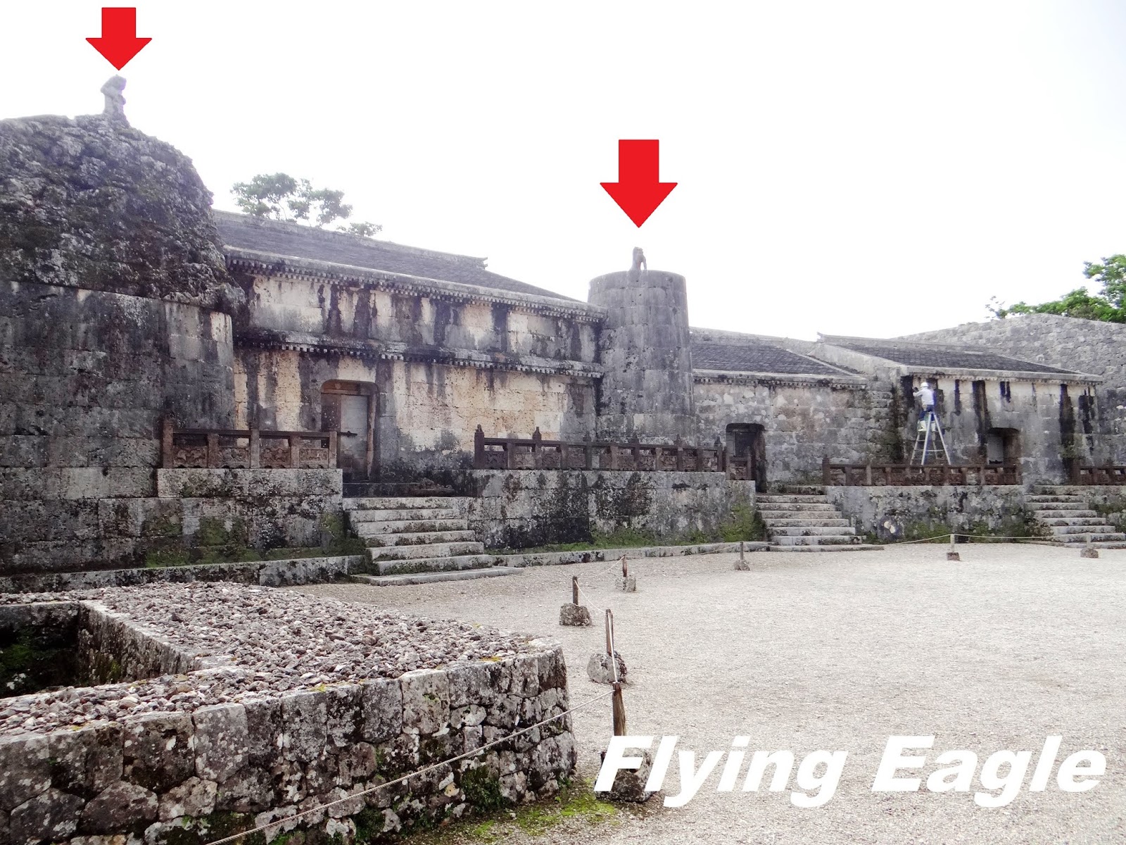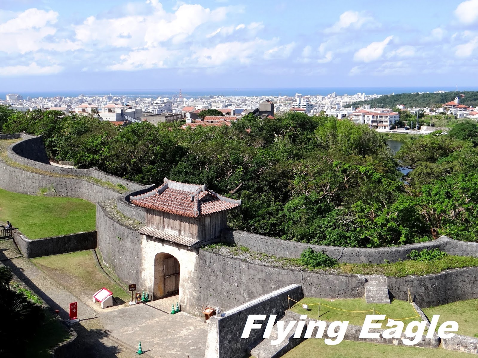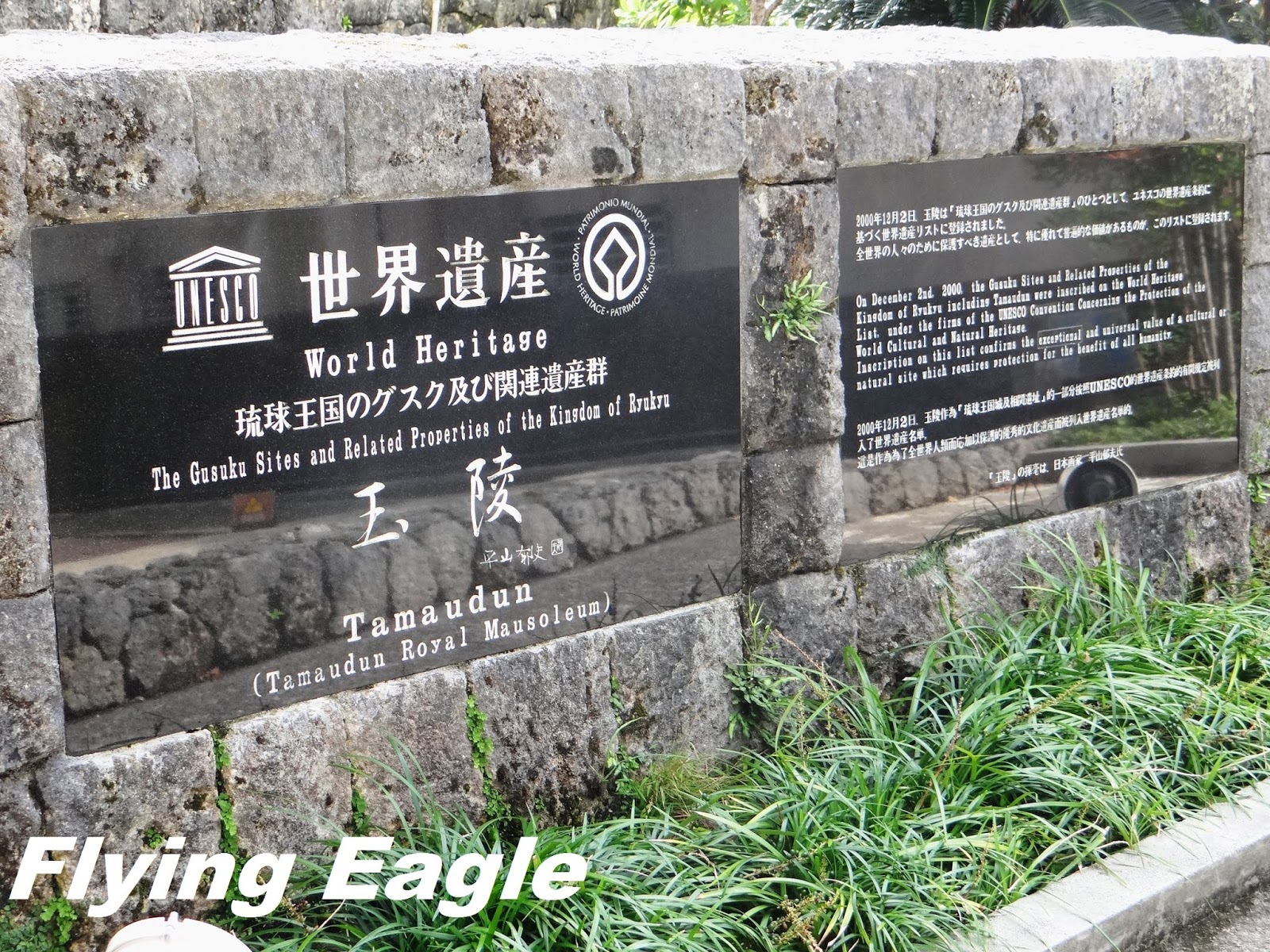 到訪時間:Nov. 2018 這天一早我們前去租車公司,路上竟然看到以廣東話口語寫的一行字,意即生存就是為了吃。原來是一家中餐館,用別出心裁的手法招徠顧客。 我們自駕遊的第一站是首里城,這座紅色的世界遺產代表琉球王國的光輝歷史。首里城建於13-14世紀,15-19世紀間是琉球國都城和王宮的所在地。到了首里城,首先見到的是守禮門,門上題有「守禮之邦」,取自明神宗冊封琉球國王詔書中的詞句。在守禮門前碰到兩位女士臉上抹著厚粉,慎而重之地穿上鮮艷的傳統服飾。進門後就看見園比屋武御嶽,御嶽即古時琉球人祈願的場所。園比屋武御嶽建於16世紀,是當時琉球國王出巡時祈求路途平安的地方。仔細端詳御嶽的石門,石灰岩的建築中間是木製門。屋頂兩側有翹起的魚尾,魚身的鱗片清晰可見。御嶽石門在2000年被聯合國教科文組織列為世界遺產。 進首里城要經過一重又一重的門,下一道是歡會門,由此進入首里城的外郭。當年為了歡迎中國使節,城門便以歡會命名。石造的城門上有木製的瞭望台,門的兩側還有石獅坐鎮,據說可以驅魔。再下一道是漏刻門,漏刻即水鐘,漏刻門上的塔樓裡有水槽,依其滴漏的水量來計時。報時人擊鼓報時,而瞭望台則接著敲擊大鐘向全城報時。進了漏刻門就看到日影台,從前的琉球人按日影的軌跡來計算時間。一直以為琉球人過著較悠哉的生活,沒想到他們對時間如此重視!奉神門是首里城公園的入口,也是付費區。區內有更多琉球的古物,不過我們因另有行程,就此止步。不料在我們到訪後一年,首里城慘遭祝融,破壞程度嚴重,不知何年何月才能修復,讓人不勝唏噓。