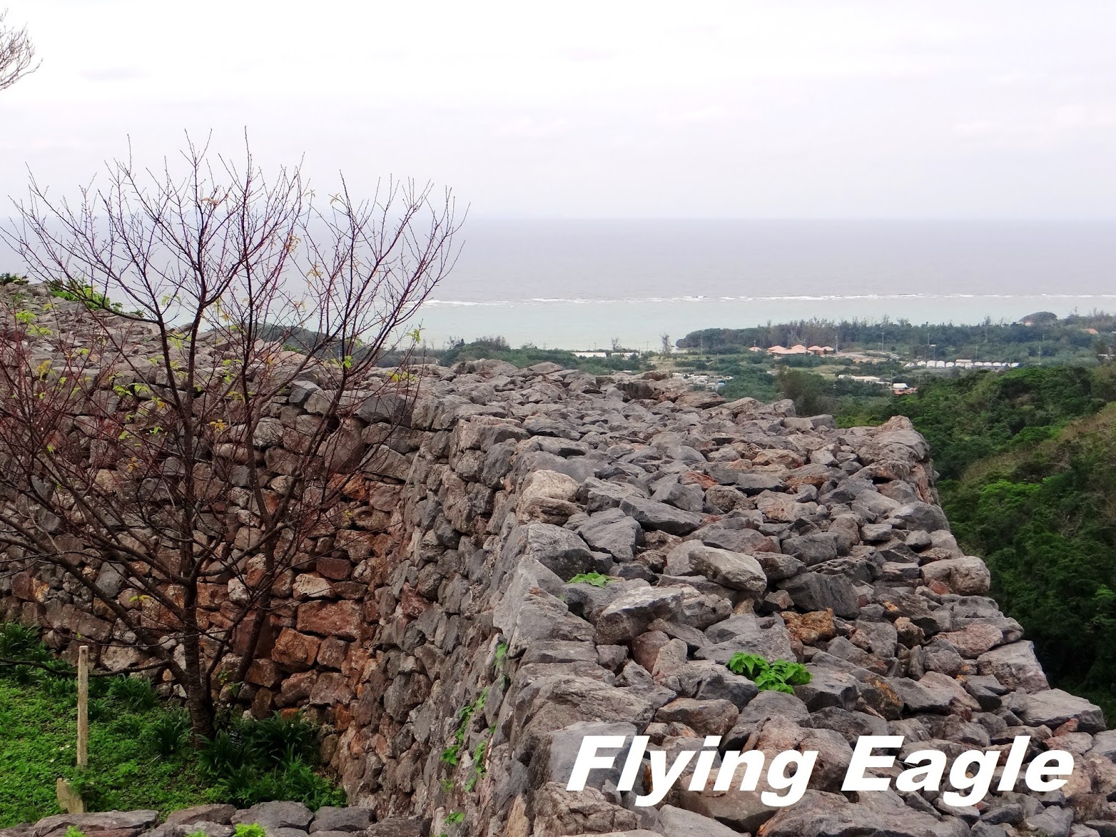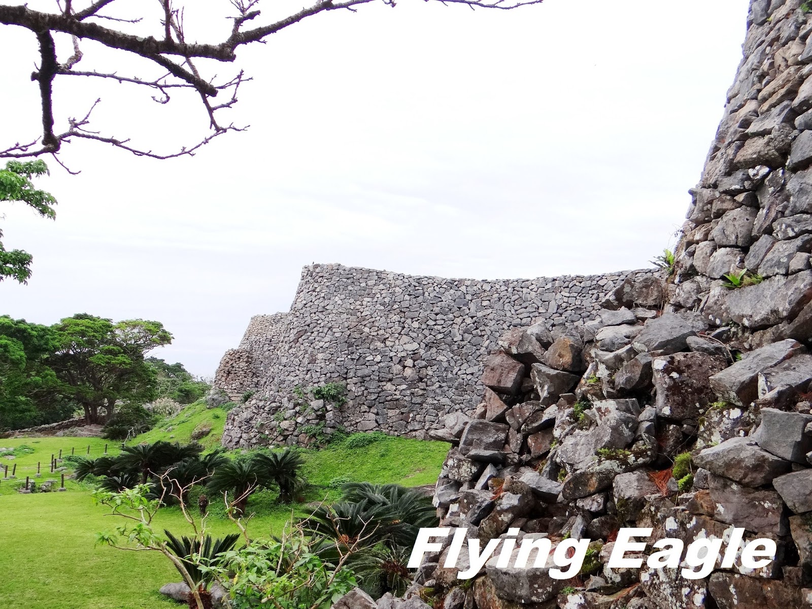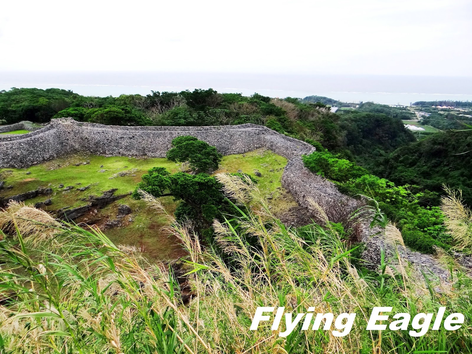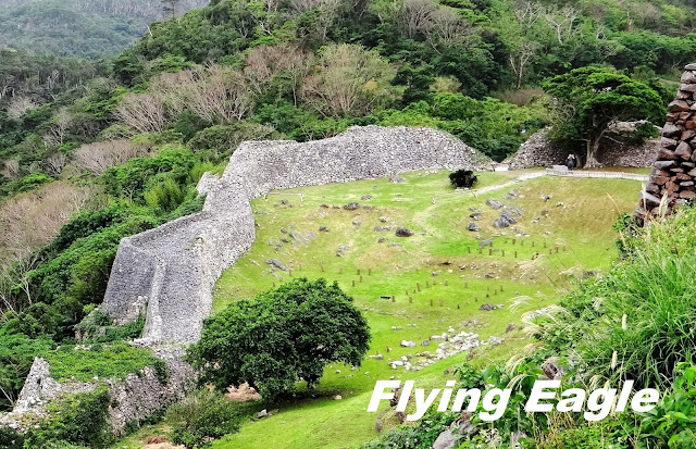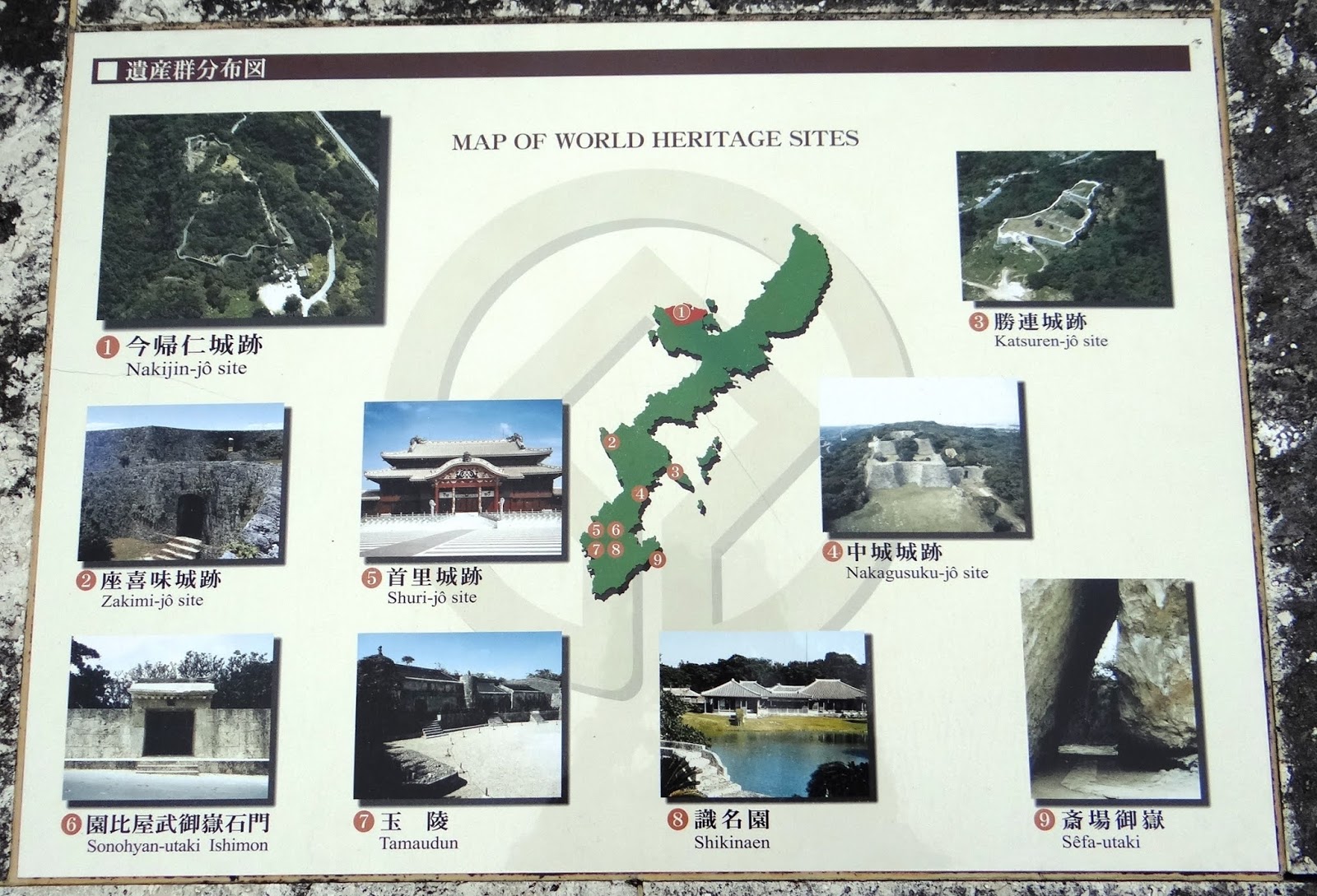 琉球昔有北山、中山和南山三股勢力,各有自己的範圍。北山王統治本島北部,其居城即今歸仁城。15世紀琉球王國成立後,此地成為官員的居所。今歸仁城建於山丘之上,居高臨下,易守難攻。它擁有八座城郭,規模僅次於首里城。城牆長1.5公里,高3-8公尺,被稱為沖繩版的萬里長城。 我們進入城區便看到由小石頭砌成的灰牆,城牆蜿蜒有如波浪。這波浪狀的城牆乃因受中華文化的影響,有別於日本傳統的直線型城牆。登高遠眺,大海映入眼簾,綠色的草地上還有排列整齊的石樁及石塊,是往昔建築殘餘的基底。微風吹來,芒草隨著擺動,更添「俱往矣」的蕭條感。 ▲地圖中標明遺產群的位置。