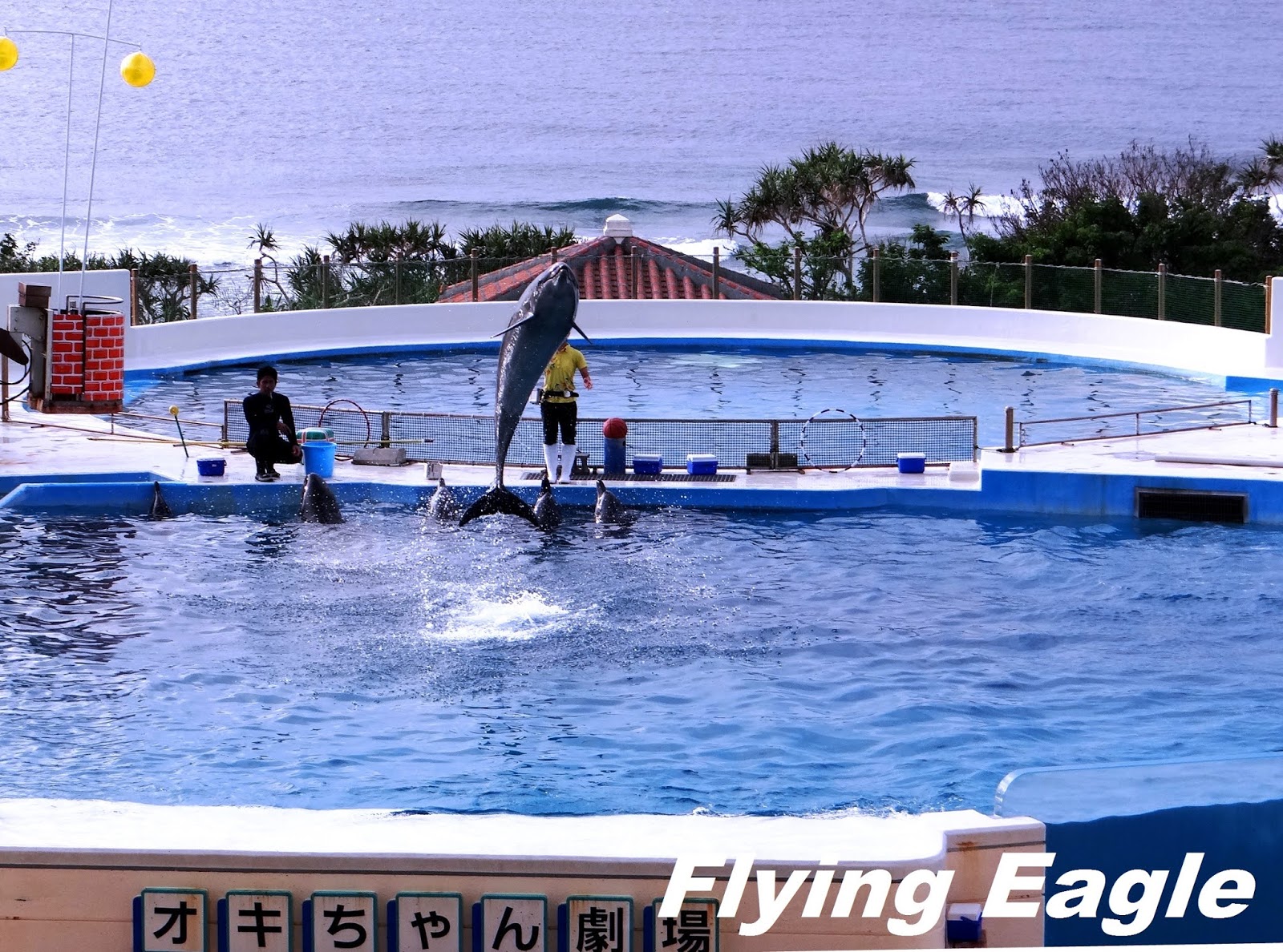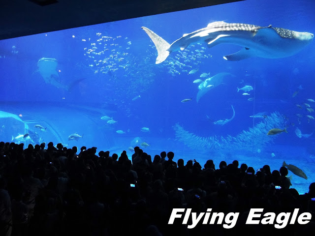 美麗海水族館老少咸宜,一向吸引大批遊客。我們特意選在下午四點後入場,一則避開人潮,二則門票有折扣。此時距閉館仍有2.5個小時,時間綽綽有餘。我們看到水底滿佈蕈類,也看到大魚小魚結伴游,好奇小魚難道不怕小命不保?看來海洋中有難以明白的生存法則。接著我們逕赴「黑潮之海」欣賞鯨鯊餵食表演,黑潮之海是世界第二大的水槽,容量高達7500立方公尺,主要展示的是鯨鯊與鬼蝠魟。每天兩次的鯨鯊餵食表演難能可貴,水槽前總擠滿黑壓壓的人群 ,爭相目睹這個重頭戲。 ▲海豚一躍而起。