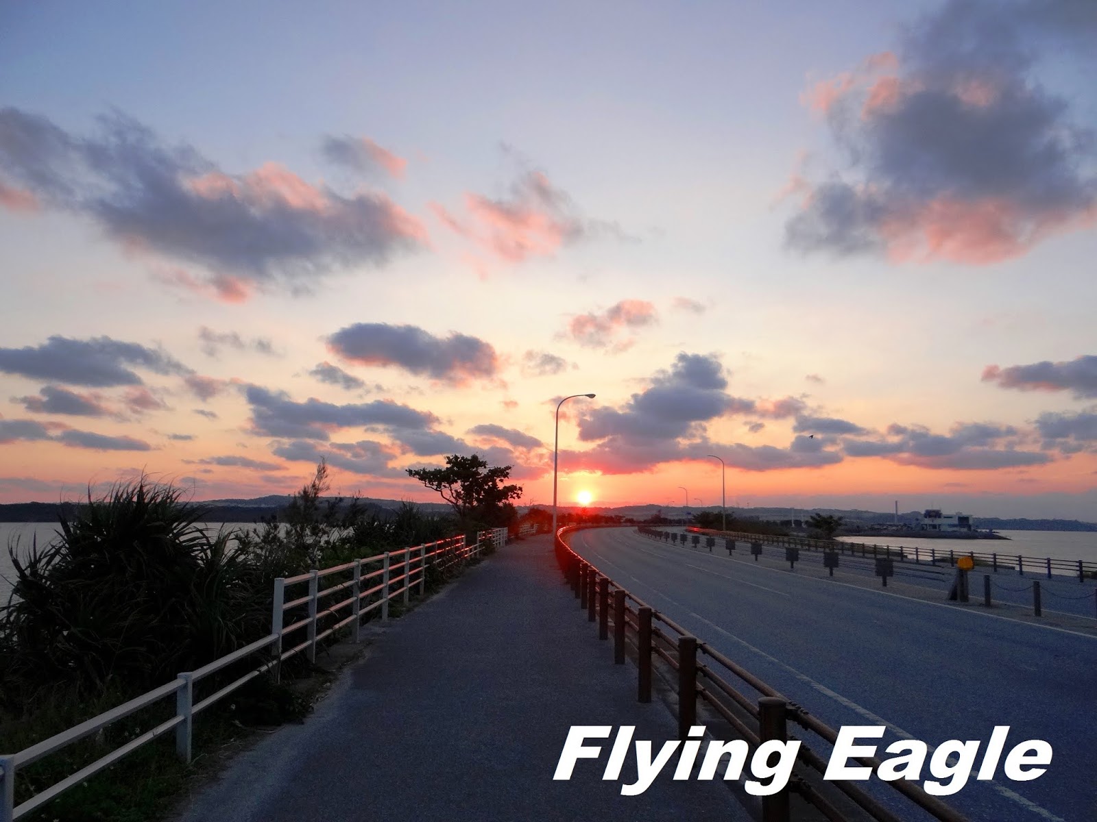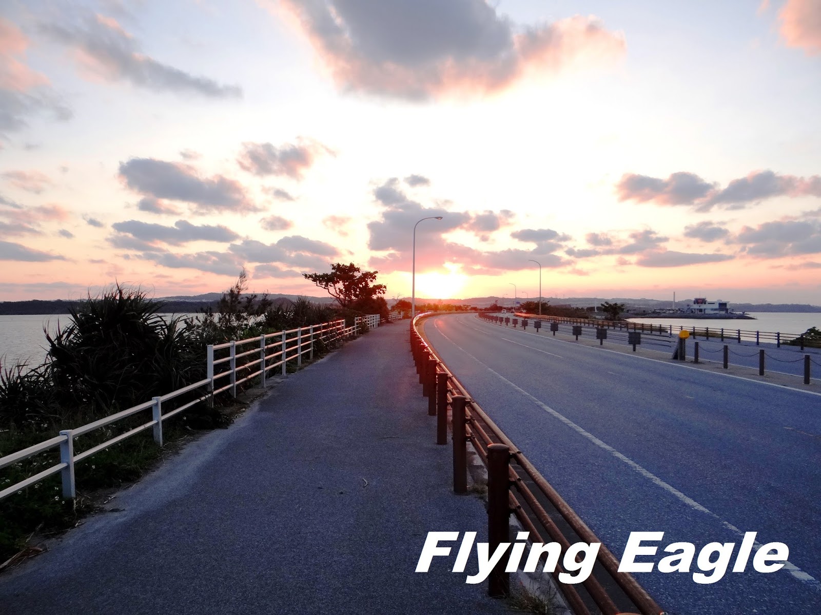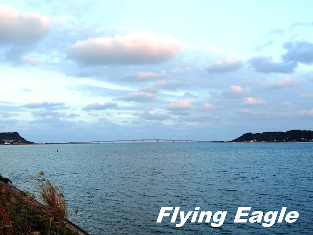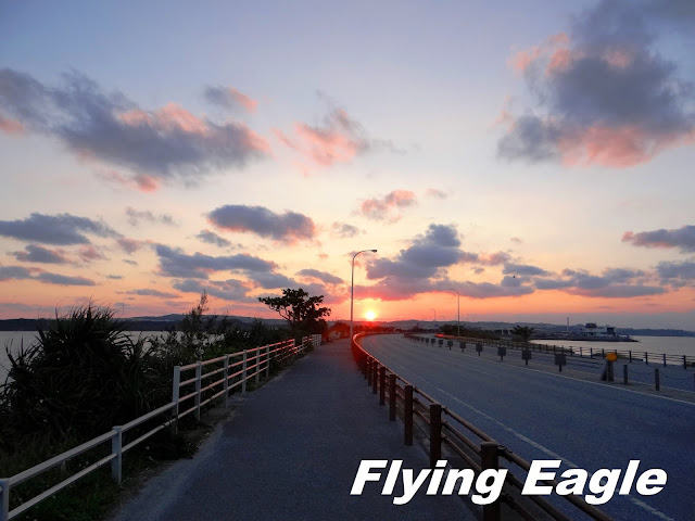 海中道路連接沖繩本島及離島平安座島,全長4.75公里,建於70年代,後又擴充為四線道。在修建道路前,由於這一帶海域較淺,兩邊的居民會在退潮時步行穿梭。海中道路便修建於淺灘的堤壩之上,所以和一般的跨海大橋有所不同。道路行經不少海灘,沿途風光旖旎,成為沖繩著名的兜風去處。我們是為了落日來的,長長的道路直奔夕陽而去。紅日在眼前從光彩眩目漸趨暗淡,我們也捕捉到它在下台一鞠躬前的最美麗瞬間。