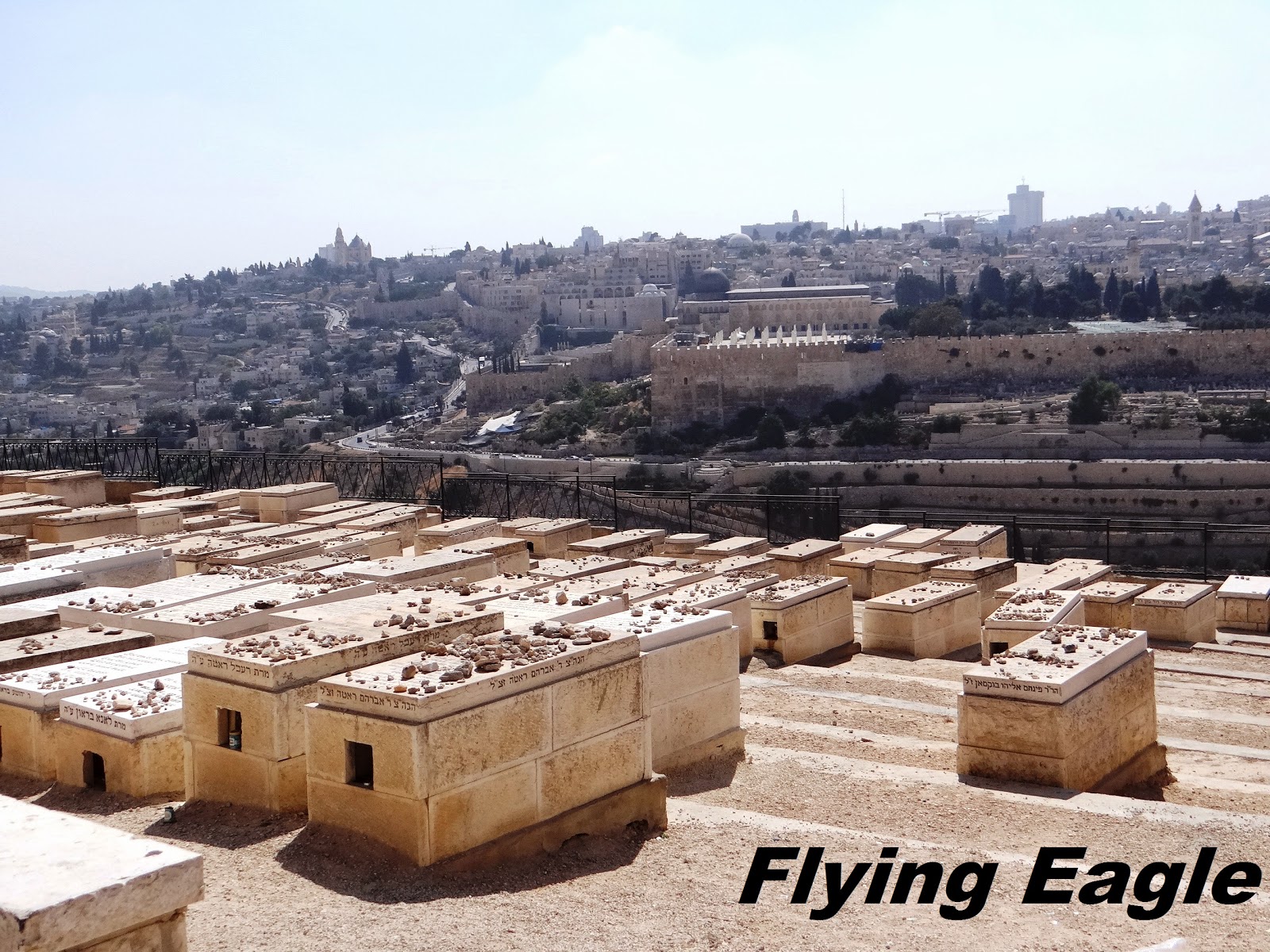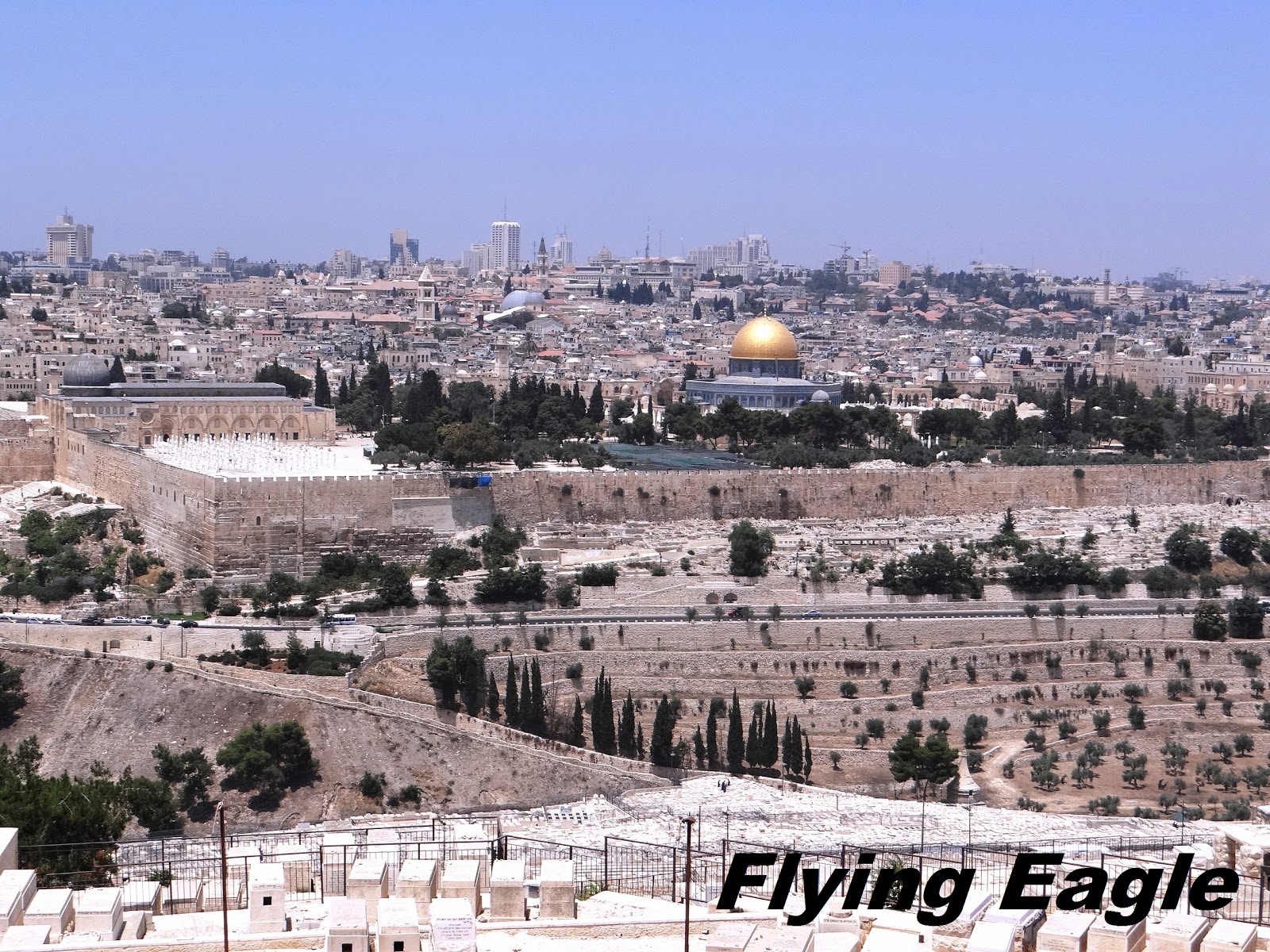 經過了長途飛行和舟車勞頓,我們抵達了耶路撒冷。在餵飽肚腹後,開始我們的第一站──橄欖山。橄欖山並非很高的山,僅有約800公尺高,但在此可將耶路撒冷城盡收眼底。新約聖經記載耶穌經常在橄欖山禱告並教導門徒,最後並在山下的客西馬尼園被抓。從這裡遠遠可看到一個金光閃閃的屋頂,那是位於聖殿山上的大磐寺(Dome of the Rock),是一座回教的清真寺。