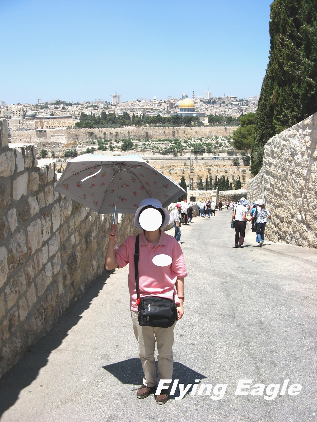 我們從橄欖山沿著棕櫚主日路(Palm Sunday Road)往下走,這條路是主耶穌騎著驢駒進耶路撒冷的路。路雖然舖了柏油,但頗有斜度,並不好走。附圖是2008年聖地遊時所照,居高臨下可看到耶路撒冷舊城和金頂的大磐寺。