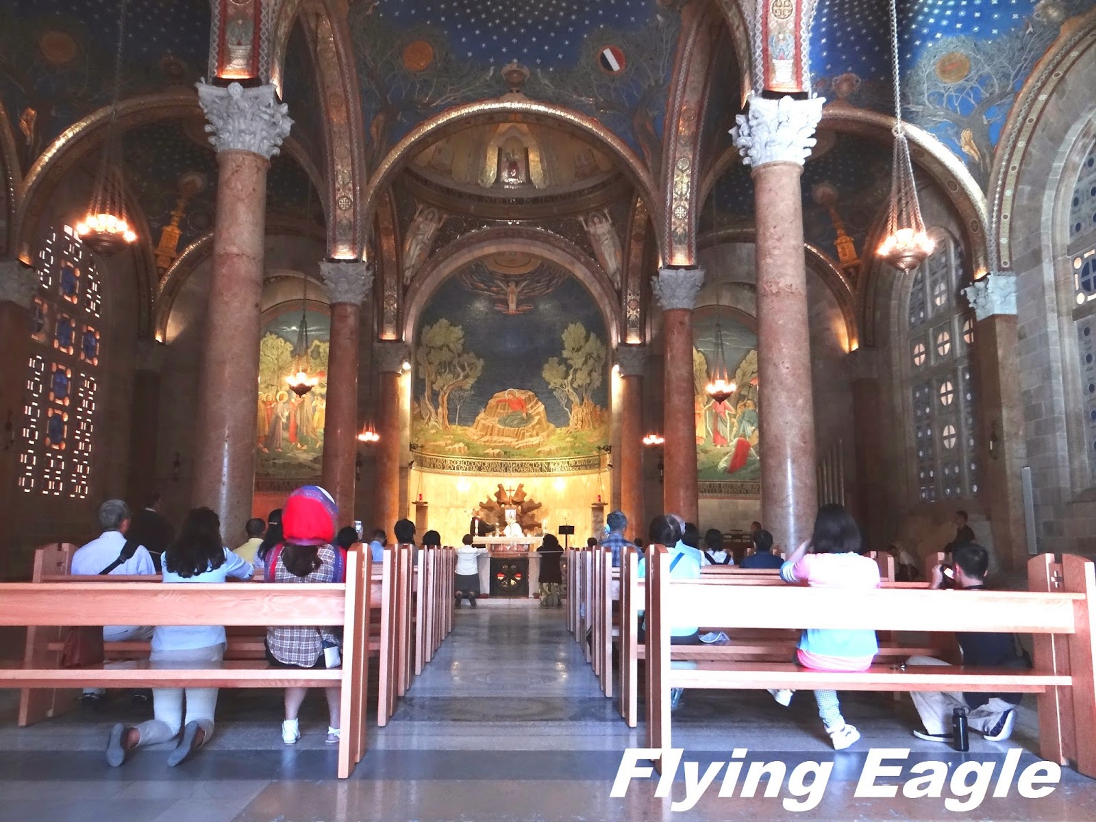 一進教堂立即就覺得進入一個幽暗的世界,只有極有限的燈光,以及透過有色玻璃從室外照射進來的微弱光線,和堂外的明亮成強烈的對比。原來這樣的設計是有心安排的,為要使人感受到主耶穌上十字架前心中的憂傷痛苦。祭壇正前方就是那塊大石頭,石頭很平坦,旁邊圍了起來,很多遊客都在圍欄外跪著祈禱。
