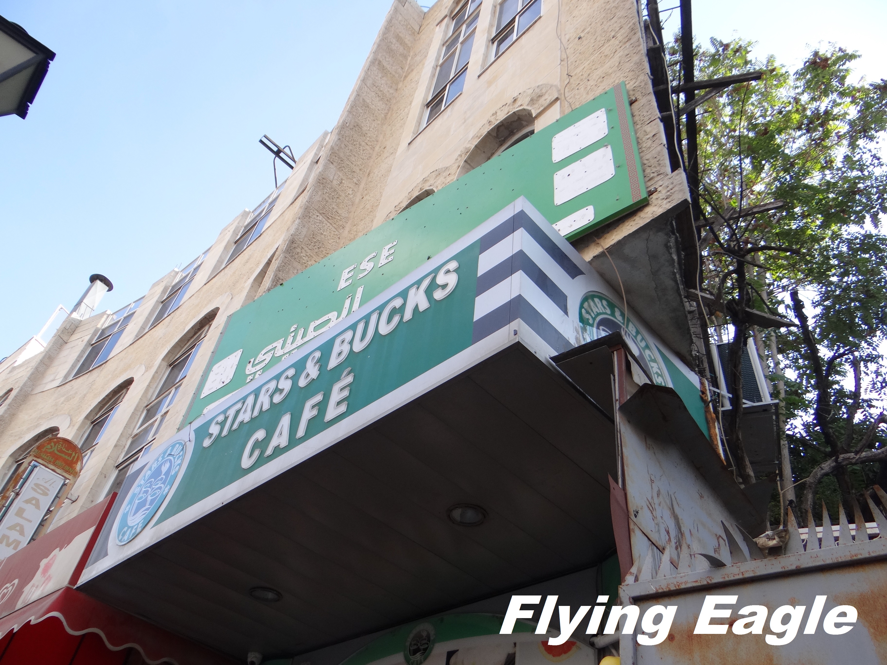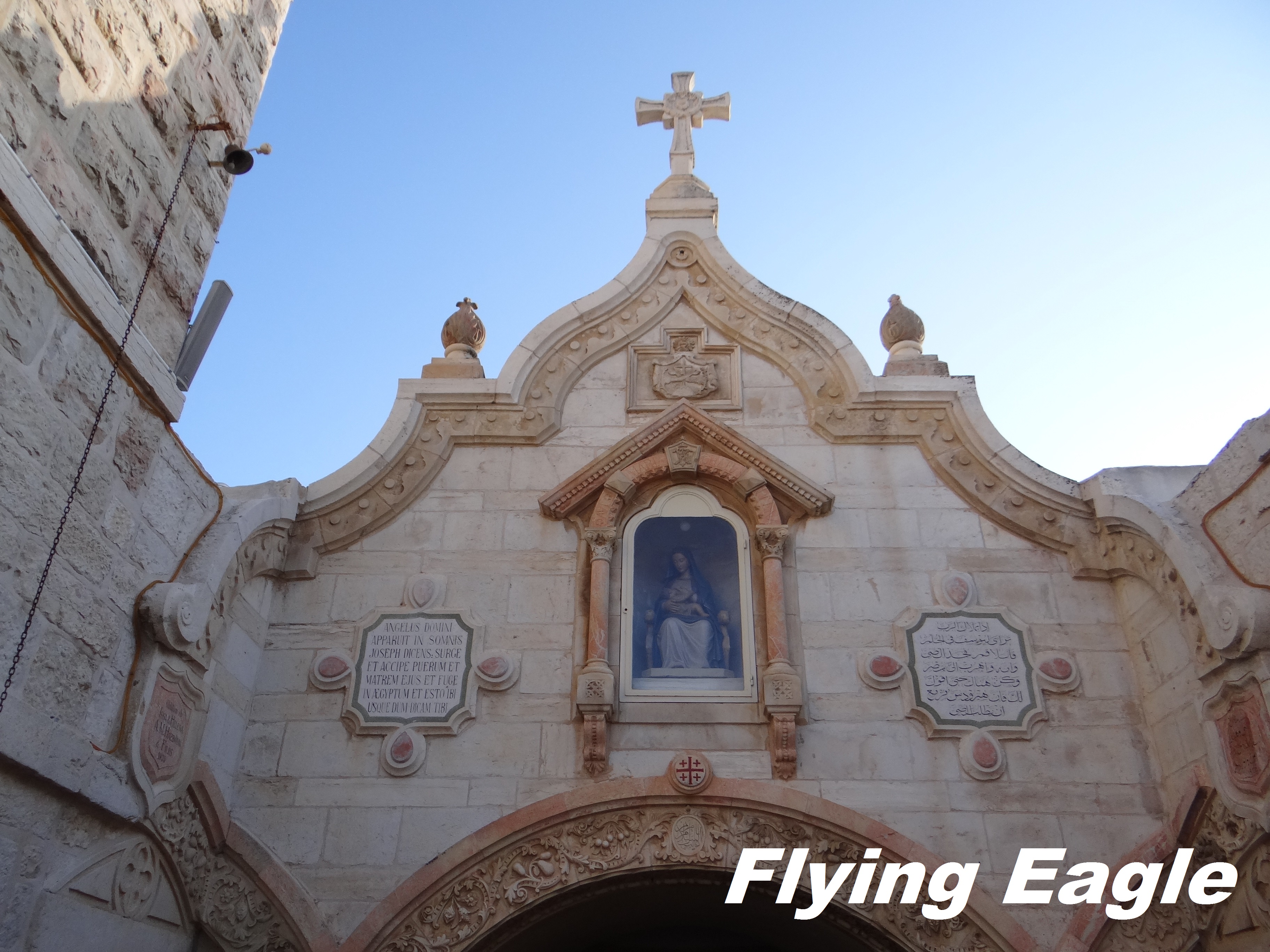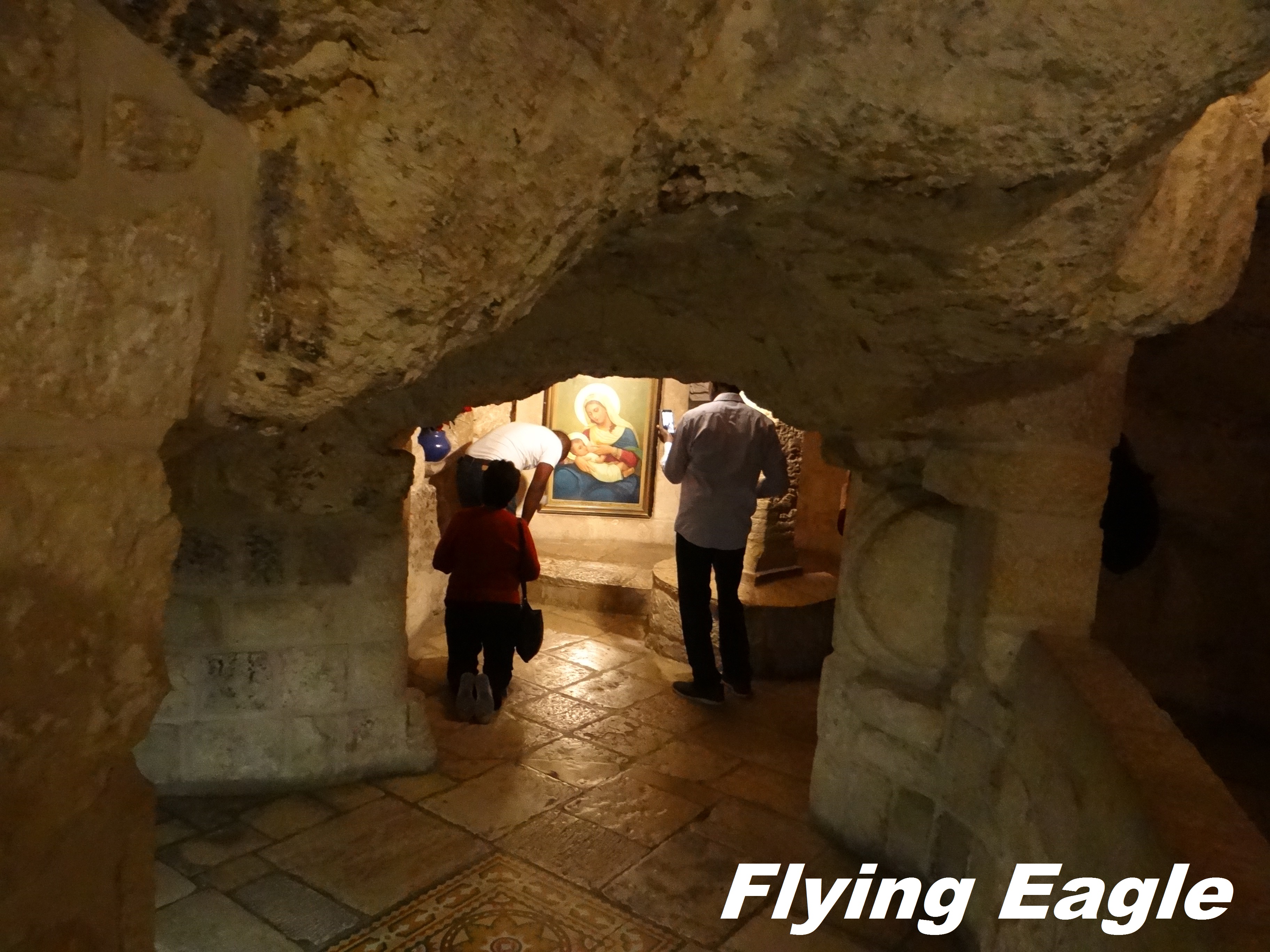 下一站是同樣位於伯利恆的乳洞教堂(Milk Grotto Church)。我們沿途看到不少似曾相識的咖啡店,但招牌令人莞爾,原來這世界上到處都有山寨版。乳洞教堂離主誕堂很近,步行約五分鐘可達。原址是建於五世紀的拜占庭教堂,如今的教堂則建於19世紀。聖經記載,希律王為了要殺主耶穌,下令屠殺伯利恆所有兩歲以下的嬰兒(馬太福音2:16)。傳說約瑟一家在逃亡時暫避洞穴,馬利亞在哺乳時滴下奶汁,洞穴便變為白色。乳洞教堂的外觀是乳白色的,門的上方還有馬利亞哺乳的畫像。教堂 一部分仍是洞穴,有些地方必須要彎身而行。