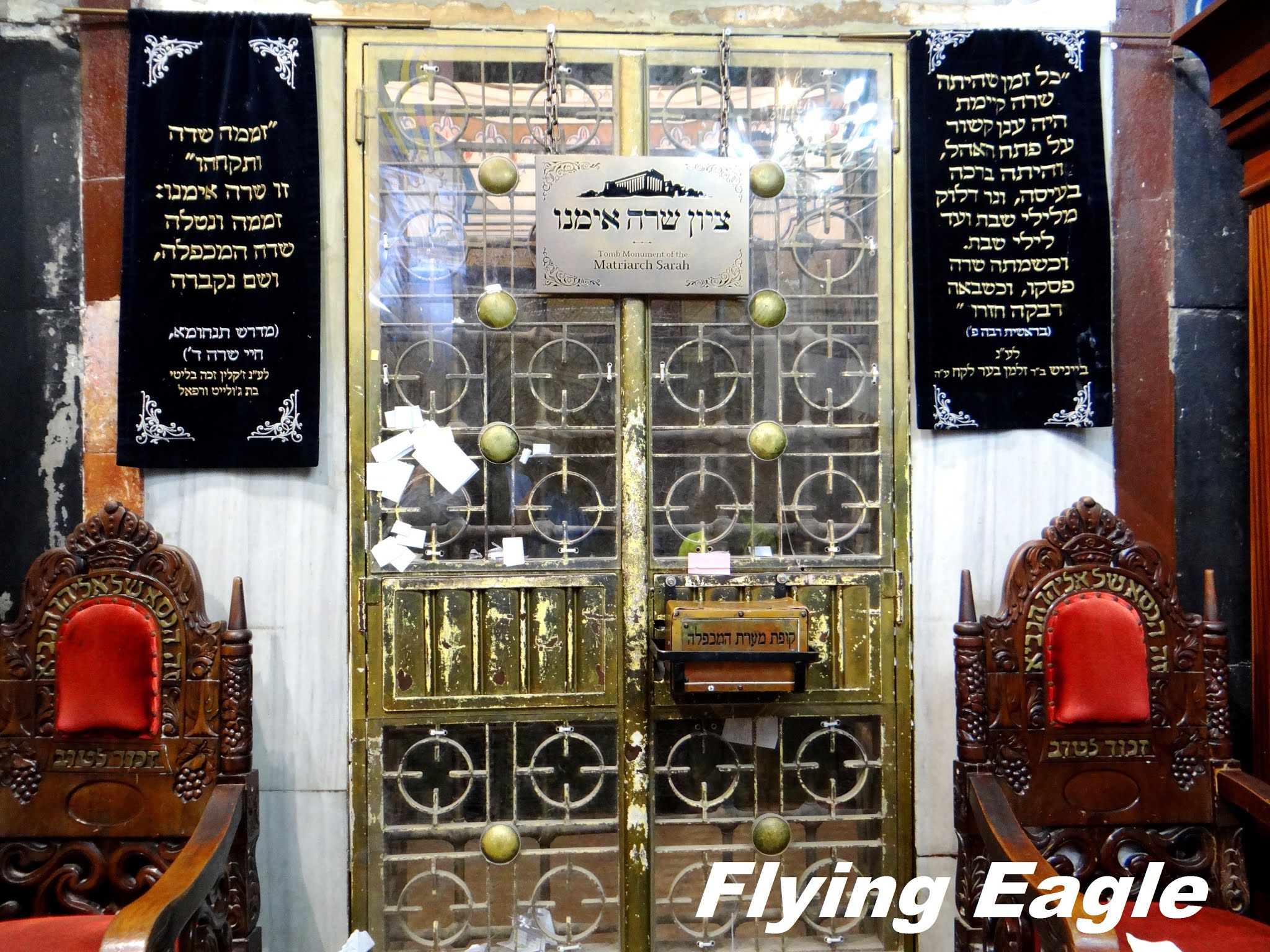 我們由猶太區入口進入上層洞穴,牆上張貼著告示,提醒訪客須有合宜的衣著。入內後便分別看到之前提過的先祖的墓。我們所見的都是衣冠塜,鎖在金色的大門裡,遊客只能從縫隙中端詳。實際的墳墓位於下層洞穴中,並不開放讓公眾參觀。