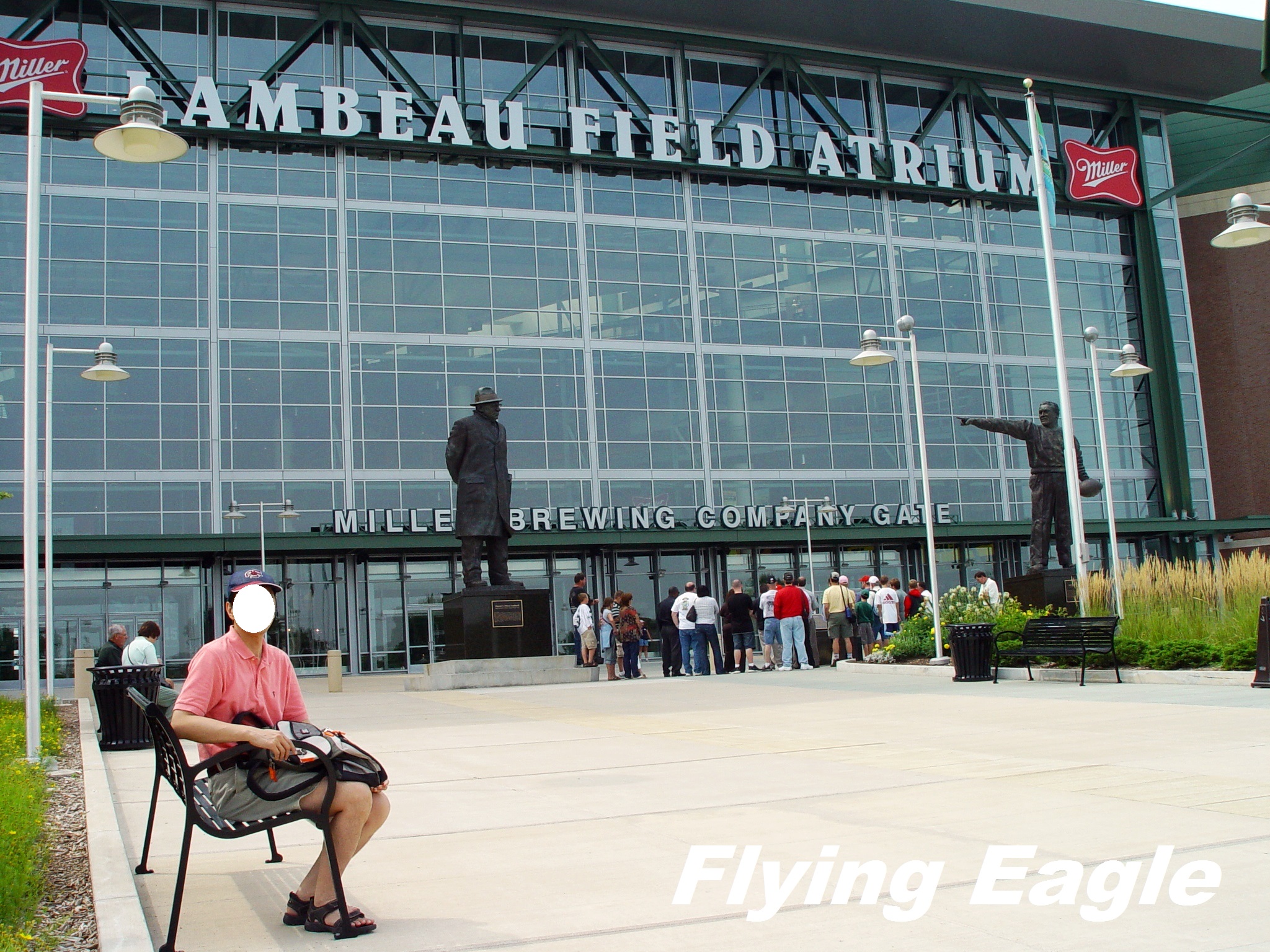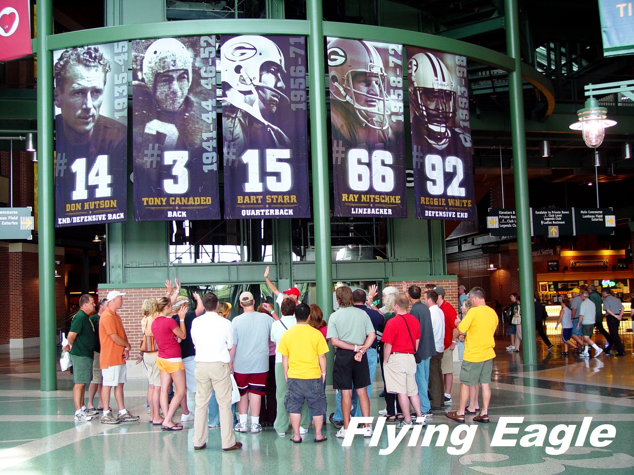 綠灣包裝工藍博球場(Green Bay Packers Lambeau Field) 熱愛美式足球的球迷,往往對足球聯盟(NFL)的球隊和球星如數家珍。在足球聯盟中的32支球隊中,綠灣包裝工獨樹一幟,因為其他球隊全位於大都會區,只有它立足在小城市。綠灣市的人口僅有10萬,以這樣的城市規模要養一支職業球隊,就像小蝦米對抗大鯨魚。不過也正是這種精神,吸引了大批堅強粉絲。我們曾在旅途中碰見身著綠灣包裝工運動衫的男士,一問發現他是加州人。此外,在美國各式運動的職業隊伍當中,包裝工是唯一不以盈利為目的而營運的球隊,球隊的股東乃36萬名粉絲,這點同樣不可思議。 面對綠灣包裝工的大樓,隆巴迪(Vince Lombardi)和藍博(Curly Lambeau)的銅像分別位於門口左右,這兩位均是帶領球隊寫下彪炳戰績的教練。傑出的電影業者得到的金像獎叫奧斯卡,而美式足球超級盃的冠軍則可得到隆巴迪獎座。藍博則在1919年創立綠灣包裝工,所以球場以他為名。球場於1957年啟用,是足球聯盟中持續使用最久的球場。在幾度翻修後,現在可容納八萬餘人。 我們在解說員引導下,前往平時無法前往的禁區。私人包廂果然視野絕佳,球場上的動態全可一目瞭然。解說員表示,擁有私人包廂的代價是一年10萬美金左右。可想而知,今日的數字必然高出許多。之後我們從球員進場的通道步入球場,綠和金是球隊的標誌色,在陽光下燦爛耀眼。此時耳際彷彿響起觀眾的吶喊和歡呼聲,想到球迷在綠灣的嚴冬坐在這球場觀賞比賽,他們的熱情真不可小覷! ▲球場門口是兩位戰績彪炳教練的銅像。 ▲球隊英雄榜。