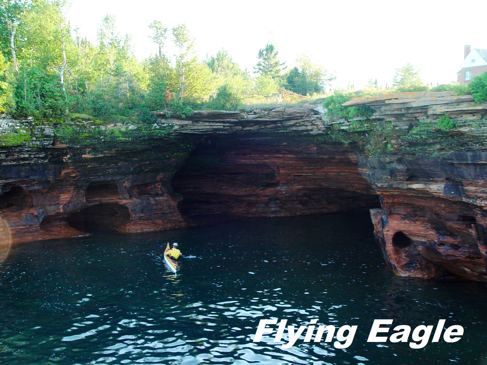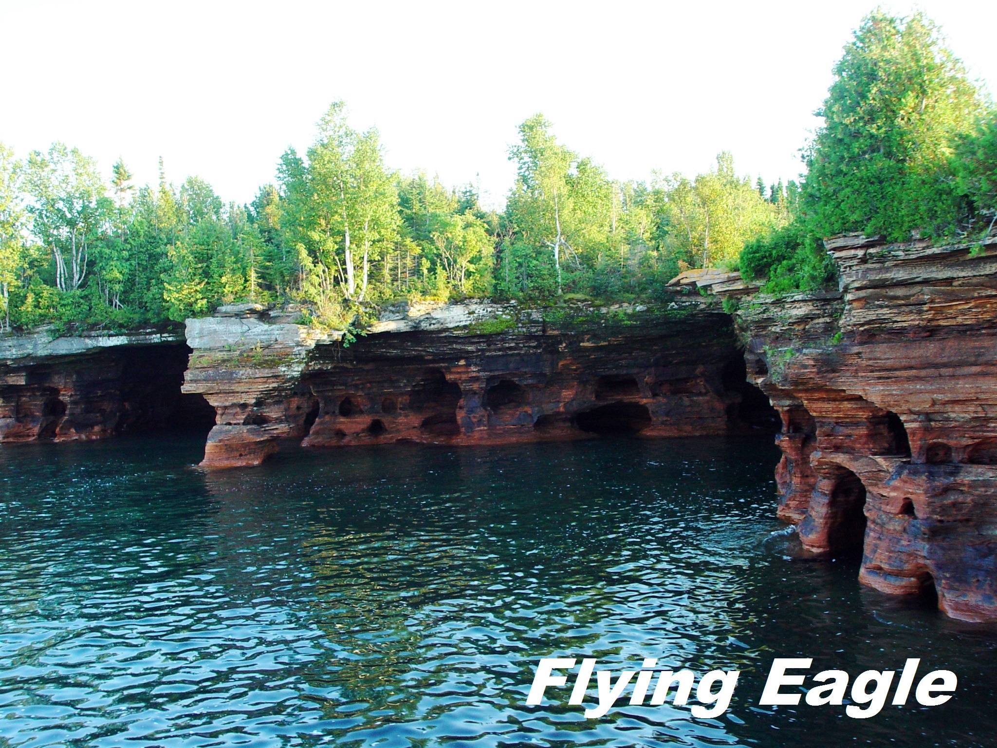 使徒群島國家湖岸(Apostle Islands National Lakeshore) 使徒群島國家湖岸位於威斯康辛北部,最靠近的城市是貝菲爾德(Bayfield)。21座小島散布在蘇必略湖岸,島上擁有奇特的岩石地形、原始森林和眾多的古老燈塔,被稱為蘇必略湖的寶石(Jewels of Lake Superior)。蘇必略湖是世界最大的淡水湖,水質純淨、沿岸風光明媚。之前寫過的大淺灘國家紀念區、皇家島國家公園和彩岩國家湖岸,全和蘇必略湖有關,其他四大湖瞠乎其後。可惜湖的中文名稱乃按音譯,未能表達英文名稱優越之意。 園區最美的景色必須從湖面欣賞,我們在傍晚時分從貝菲爾德搭船遊湖,全程約2.5小時。以前總以為美國中西部一片平坦,多是農地。直到走訪這一區的知名景點才發現,中西部居民其實很享受水上生活,因為一路上見到不少人自駕船隻。遊湖航程的重點是惡魔島(Devils Island),這裡眾多的海穴(sea cave)據說是湖水花了上億年侵蝕而成。赭紅色的岩石上滿是大小的孔洞,實在不得佩服湖水堅持不懈的功效。