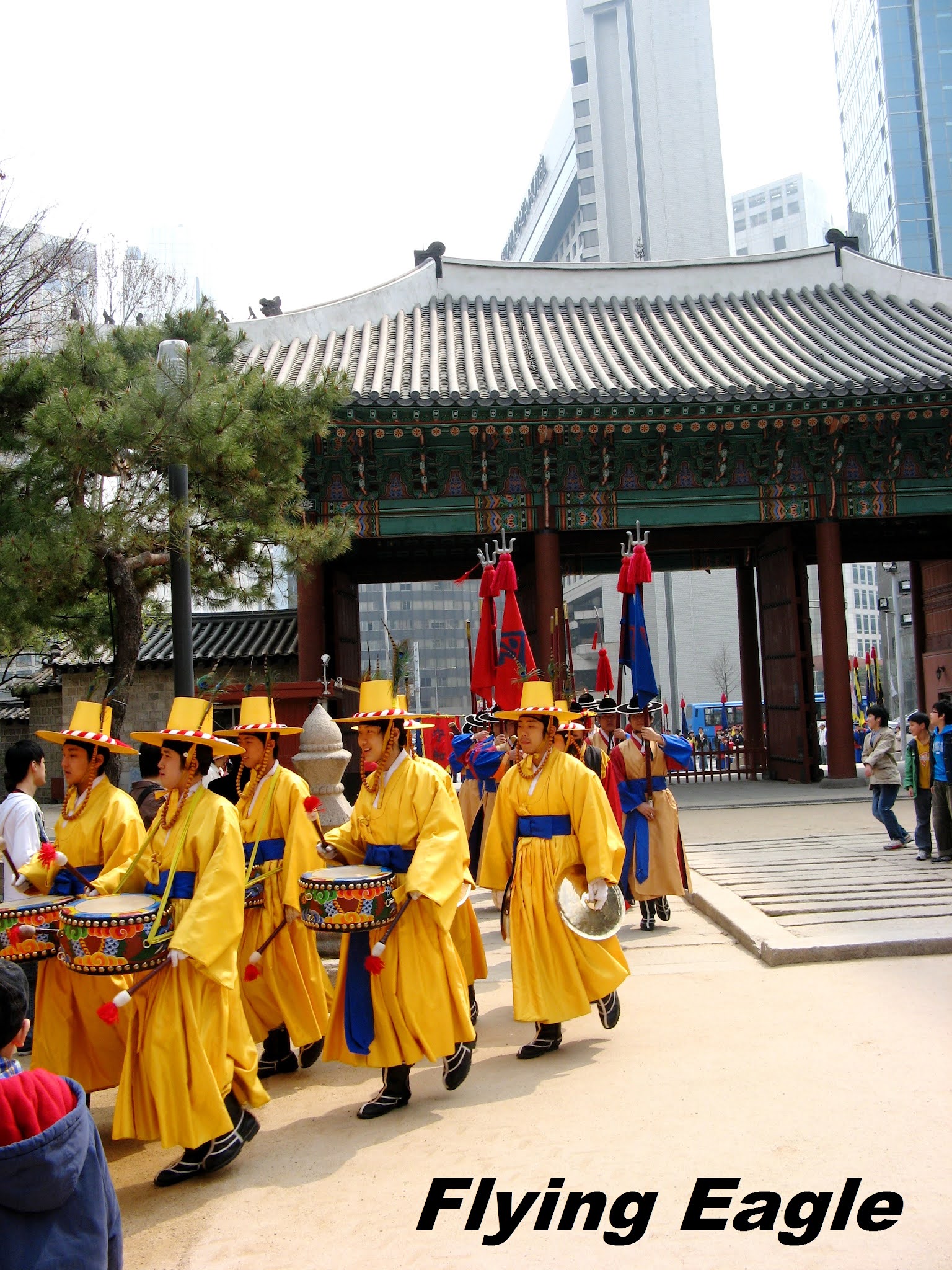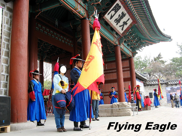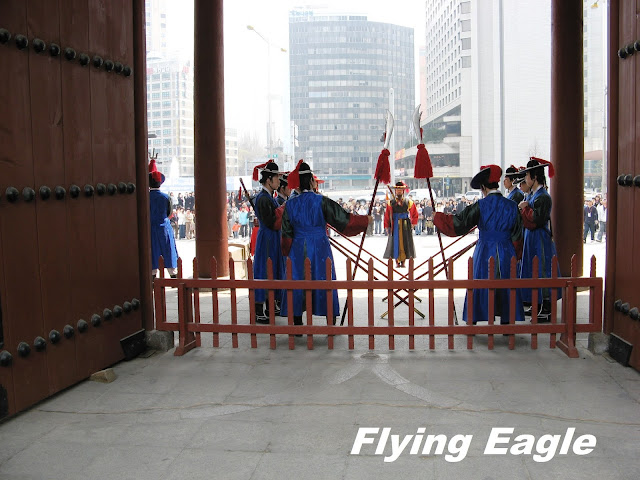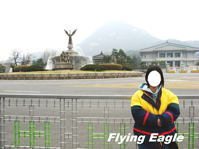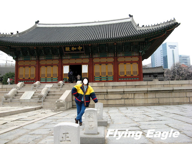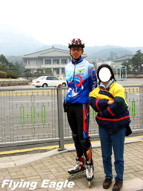 ▲練功時刻。 今昔權力中心 南韓的總統府叫青瓦台,英文為Blue House,不知是否有意和美國的白宮White House一別苗頭。這個權力中樞最特別之處是屋頂青色的瓦片,15萬塊青瓦都經過獨特的燒窯製成,經久耐用,可使用上百年。青瓦台周遭戒備森嚴,導遊只帶我們遠觀而未走近。有趣的是,我們拍照時有位年輕人踩著直排輪經過。他一身裝扮就和喜好運動的人差不多,但細看之下才發現是警察呢! 德壽宮是朝鮮王朝最後的宮殿,宮內有許多朝鮮早期的歐式建築。大漢門是德壽宮的正門,我們抵達時門前放了個繽紛多彩的大鼓。接著我們就等候王宮守門將交接儀,據說一天有三次。身著黃衣的鼓手和身著藍衣的兵丁依序就位,現場也擠滿了圍觀的人潮。我們也在德壽宮內四處參觀,印象最深的是德壽宮的中樞中和殿,殿外便是昔日上朝時文武百官站立之處。地面立著官階碑,官員依官位大小排列,井然有序。 宮裡還有朝鮮的世宗大王的雕像,這位15世紀在位的君王發明了訓民正音,也就是韓國文字,在此之前只有漢字。世宗大王對韓國的語言和文化發展帶來深遠影響,也深受韓人推崇。 ▲政治權力的中心青瓦台。 ▲猜得到此人的職業嗎?