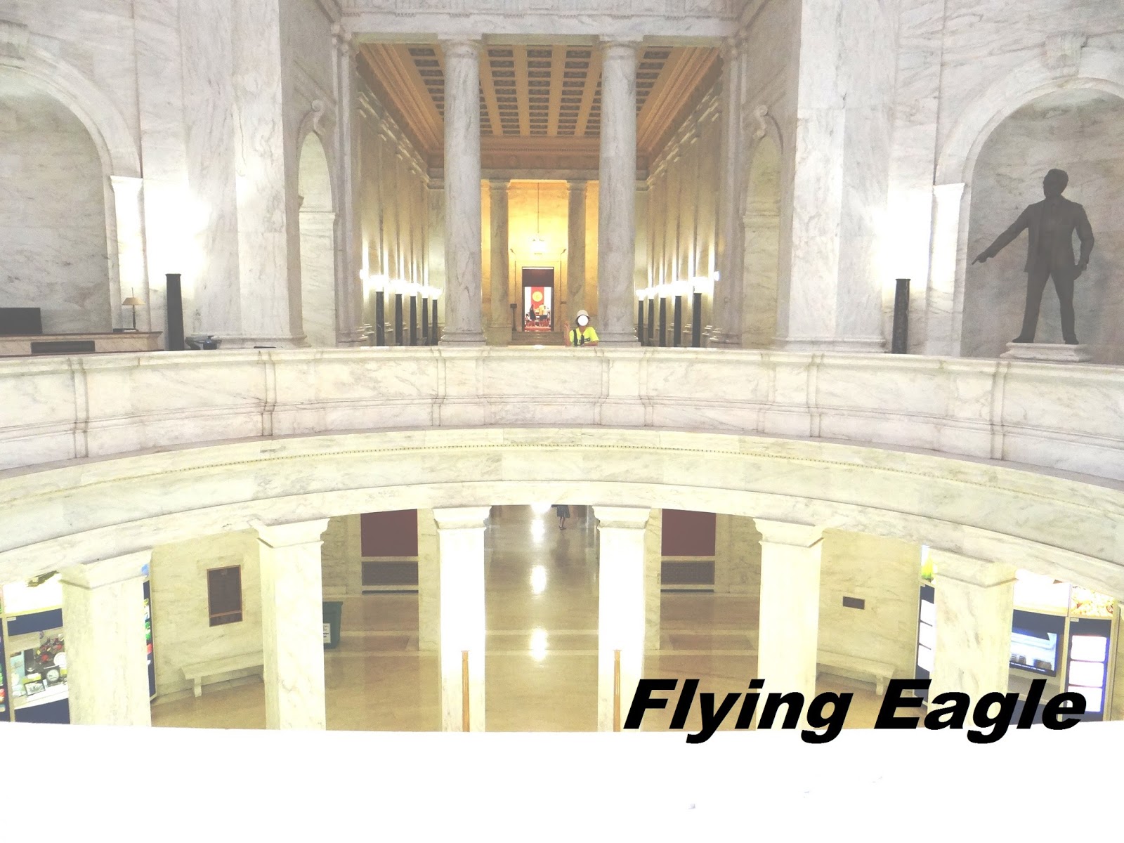 進了州府,發現沒有什麼遊客,正方便我們隨心所欲地參觀拍照。從建築物中心向上望圓頂,層層疊疊,每一個樓層都精雕細琢。我們也進了州參議會,基本上和其他州議會大同小異。我們要離開州府時頗費了一番工夫,因為最中心圓頂下的區域還向外延伸出好幾個側翼,每個都有自己的出入口,走在裡面就像迷宮一樣。請教了兩位打掃的員工,才找到我們停車方向的出口,弄得精疲力盡。