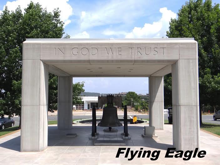 沿著州府外圍走一圈,發現州府背面的景觀比正面還要熱鬧。首先看到一個方型的亭子,亭上刻著「我們信靠神」(IN GOD WE TRUST)。美國雖說是以基督信仰立國的國家,但在我們參觀過的30餘個州府中,只有阿肯色州和賓州如此清楚表明信仰。方型的亭裡有仿傚費城的自由鐘,地上還有著阿肯色的州徽。 遠遠望向州府背面,看到草坪正中央有一群人的雕像,他們是當地赫赫有名的「小岩城9人」(Little Rock Nine)。美國在60年代開始有大規模的民權運動,為有色人種爭取平等的權利。最高法院裁定,學校實行種族隔離違反憲法。此時小岩城有9位黑人學生在原本只有白人學生的中央中學註冊,導致贊成種族隔離的居民群起抗議。和這些居民同樣立場的州長,甚至派出國民警衛隊阻止這9位學生進入學校,事件立即成為全美關注的焦點。總統艾森豪也出手干預,警告州長不得違憲。艾森豪隨後派出著名的陸軍第101空降師(亦即在二戰時執行諾曼第登陸的部隊),接管了為數1萬人的阿肯色州國民警衛隊,並護送學生進校上課。但這幾位學生入學後,仍不斷遭受白人學生的辱罵和欺凌,甚至生命都受到威脅。多年之後,這9人在柯林頓總統任內獲頒國會金質獎章,並在歐巴馬總統就職時受邀觀禮。 ▲州府背面有自由鐘,並有大大的字宣告「我們信靠神」。