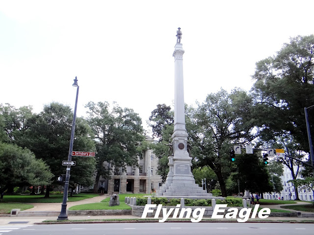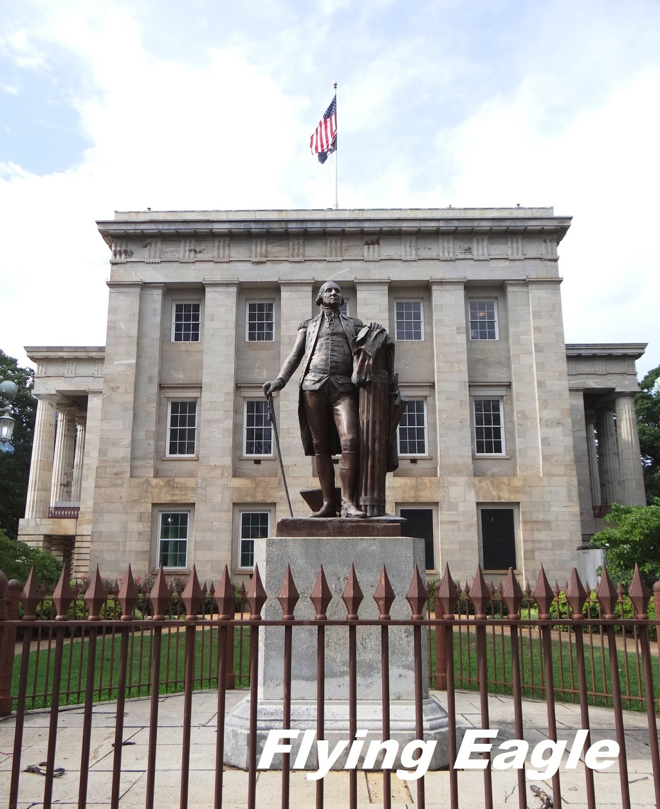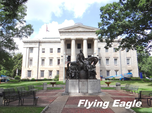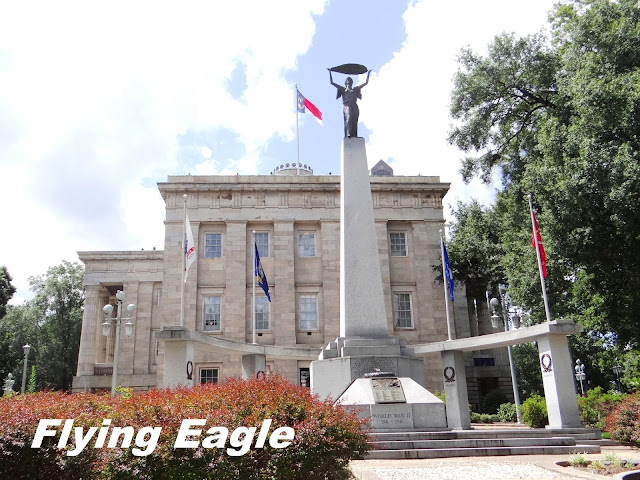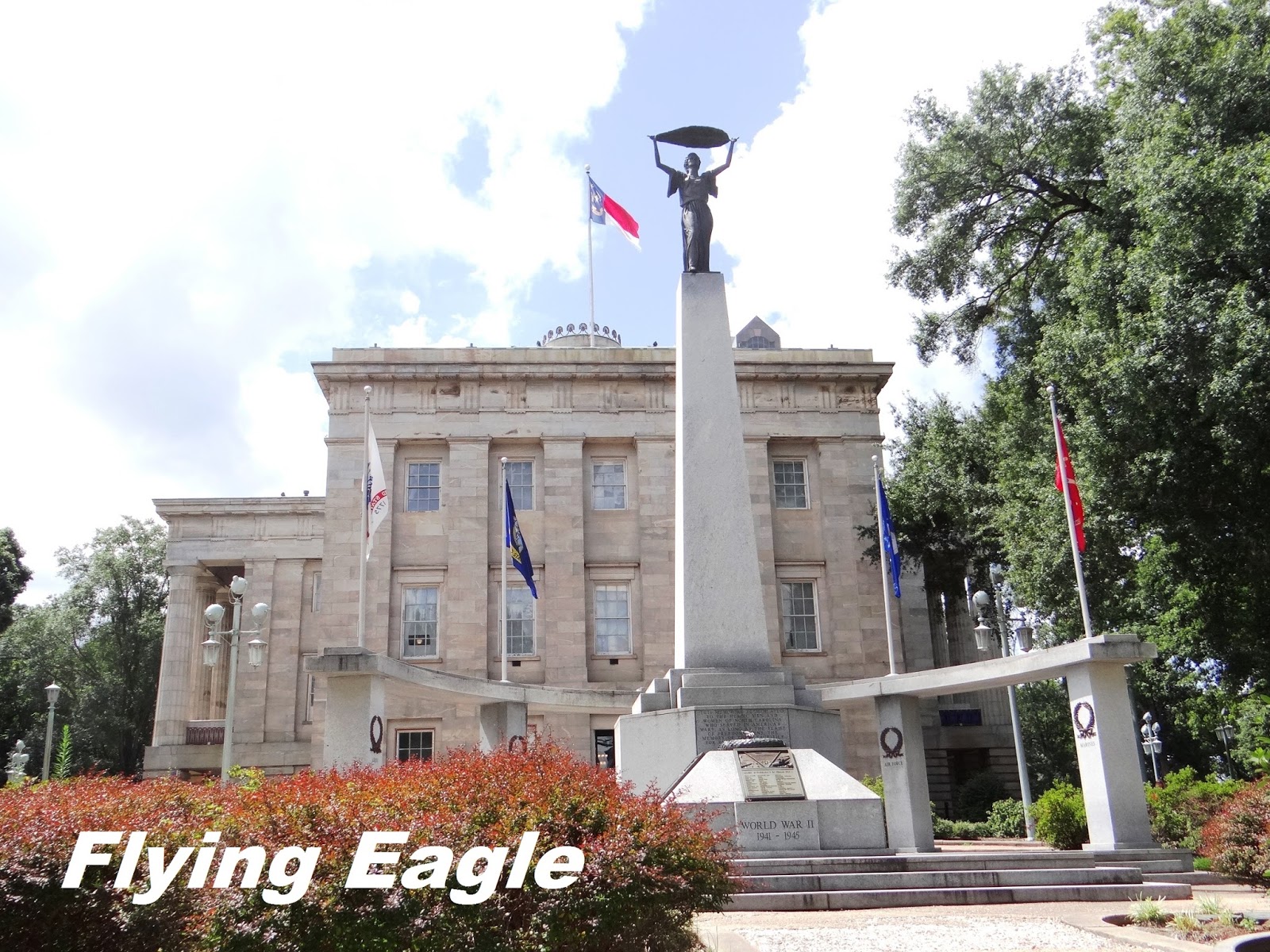 北卡州府除了正門前有座大砲,周邊的紀念碑也有著戰爭的主題。側面有北卡榮民紀念碑(North Carolina Veteran’s Monument) ,紀念2次世界大戰和韓戰的將士。碑頂的自由女神雙手高舉棕櫚葉,象徵勝利及和平。州府背面則有南軍紀念碑(Confederate Monument) ,悼念在南北戰爭中陣亡的南軍官兵。總的來說,如果繞著州府走一遭,會覺得戰爭的味道濃厚。湊巧的是,全球最大的軍事基地就位於北卡,共有5萬餘名現役軍人駐守,另還有後備及退伍軍人,整個社區超過23萬人。
