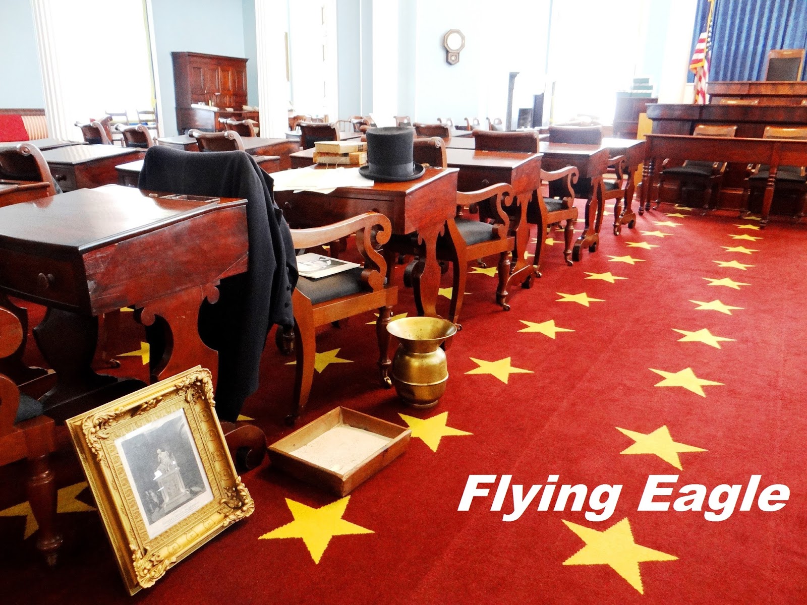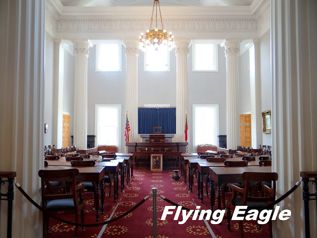 一進州府便看到一座不太像華盛頓的華盛頓雕像,原來背後有段挺有趣的故事。19世紀初,北卡為表達對華盛頓的尊崇,禮聘義大利藝術家Canova創作華盛頓雕像。但Canova沒見過華盛頓,所以當時美國派駐義大利的大使便送給Canova另一位義大利藝術家所刻的華盛頓雕像,以作參考。結果Canova雕刻的華盛頓身穿羅馬將軍的服裝,雙腿裸露在外面。他一手執筆另一手拿一塊版,正在寫總統離職的告別演說稿,寫的竟是義大利文。美國人居然不以為忤,把雕像放在州府進門最顯眼的位置。 府內的參眾議會都是歷史陳蹟,史家們殫精竭力從歷史文件中找到記錄,舉凡房間的色調、桌椅、地毯,都是經考究而複製,以呈現1840年的面貌。我們走訪許多州府,發現參眾議會的地毯都有所區別,原來這傳統行之有年。從北卡州府可以看到參眾議會都是紅色地毯,但圖案一為星星一為花朵。 ▲不像華盛頓的華盛頓雕像有段趣事。