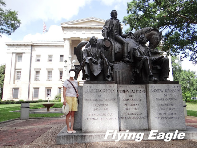 北卡羅來納州位於美國東南,是美國最早的13州之一。卡羅來納一字源自拉丁文的查理,是為了紀念英王查理一世。該州最大城市是夏洛特(Charlotte),首府則在羅利。北卡羅來納州是全美最大的菸草產地,還擁有著名的三角研究園區(Research Triangle Park)。這個園區位於北卡3個城市之間的三角地帶,是美國最大的科研中心之一,常和加州矽谷相提並論。 我們看見州府的第一印象是頗為袖珍,但其實小巧玲瓏的建築有著北卡維持歷史原貌的心意。州府於1840年完工,隨著政府組織逐步擴充,已無法把行政、立法和司法機構全數容納在內。別的州多半就擴建原有建築,但北卡則是把立法和司法機構搬到新的大樓。所以現今州府只有州長和副州長有辦公室,參眾議會都是歷史陳蹟,讓人憑弔過往。這座州府和它同年代的政府大樓相比,是少數保存原始樣貌較為完好的,它於1973年被列為國家歷史地標。 若由空中俯瞰,會看到州府的形狀像個十字架,正中央的頂端有個圓頂,但是站在地面只有從某些角度才看得到這個圓頂。我們沿著州府繞了一圈,無法確定哪一面是正門。有著高大柱子的一面看來頗為氣派,就當它是正門了。門前有3位出生於北卡總統的雕像,不過有趣的是,他們選上總統時全都是田納西的居民。 ▲州府看來較像正面的門。 ▲出生於北卡的3位總統。