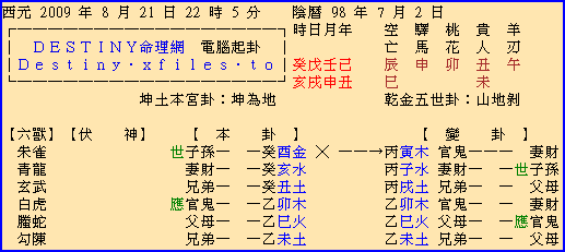 1.起卦者:本人起卦 2.起卦方式: 電腦起卦 3.相關當事人基本資料: A姓別:女 B出生年次、生肖 1982年, 狗 C外表特徵:157公分 53公斤、個性衝動、膚色黃 4.職業: 無 5.現居地:台灣 6. 起卦的那個時候心中專注所想的念頭是什麼?想請問目前住在家裡這群人 什麼時候可以搬走?! 因為婆家大伯大嫂目前在我家附近工作 所以暫住我們那 但~~~ 那女的在我懷孕期間卻一點家事都不願意幫忙 甚至跟我小姑說了一堆很過分的話 我實在對她越來越沒想法 只祈禱她可以趕快搬出去 所以拜託大大們指點指點 !!! Answer :: 世持子孫酉金動化寅木官鬼:會因為小孩的事情發生口角進而雙方緊張 父母持螣蛇入空亡:長輩沒有意見,沒有說話 世應相沖,世剋應:對方也不好受,世爻(占卜人)比較有能量 應爻官鬼被日辰戌土所合:合必須待衝開 六沖卦,六沖卦表示進行的比較快,應驗的也快 綜觀: 當發生因為小孩(或是)而產生口舌糾紛時,應該很快就會離開了。 現在應爻官鬼被日合住,待酉日(約國曆九月初)會離開。 Result :: Yes , 九月離開 |