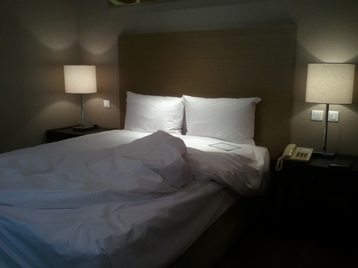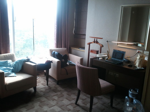 一進門,哇!!搞什麼!?怎麼這麼暗,還跟我說 upgrade 到一間樓中樓。還真的是樓中樓(閣樓 ... )。床在樓上書桌在樓下 ... 很不習慣這麼暗的空間 ...