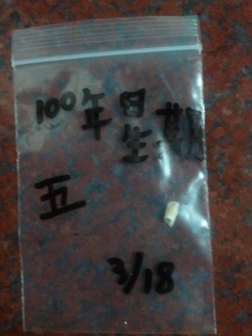 這個拍了兩張,因為時間有點久了(三月拍的 ... )。其中一張很不清楚,一開始看的時候 ... 嗯!!到底拍這個寫日期的小塑膠袋做甚麼,等切換到下一張的時侯才清楚的看到,喔!!那顆小小,小小的,小牙齒 ...