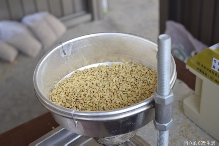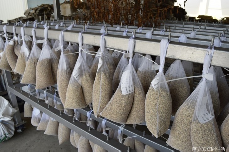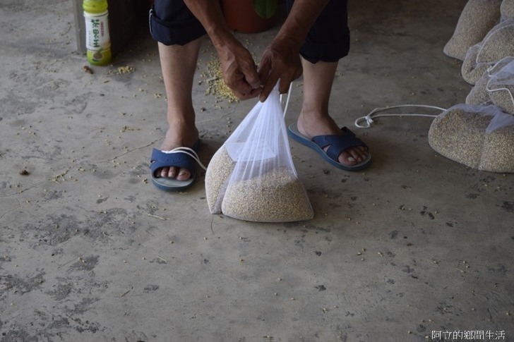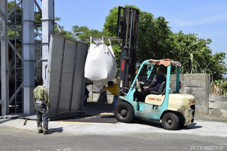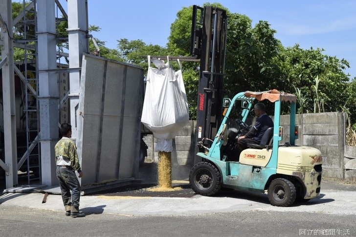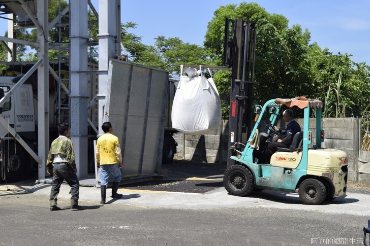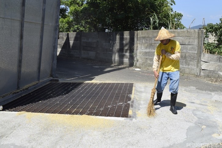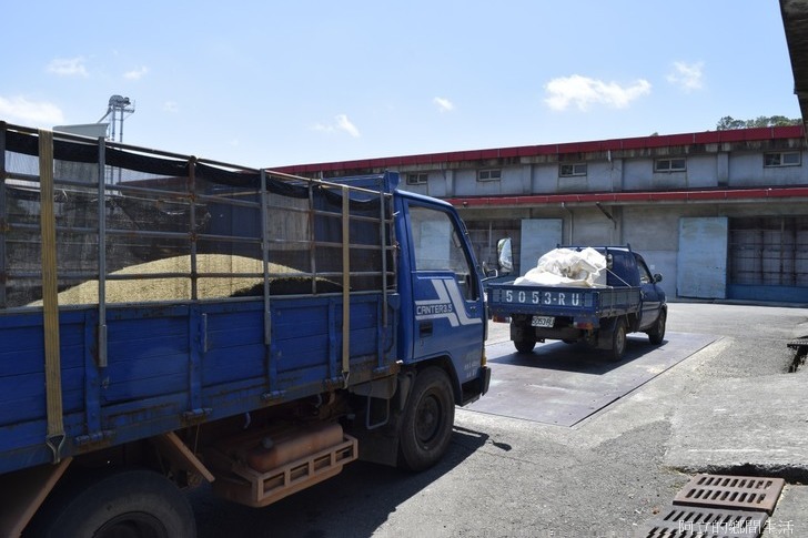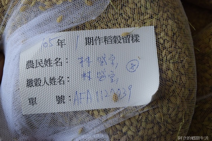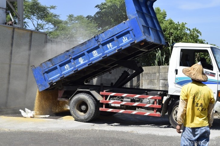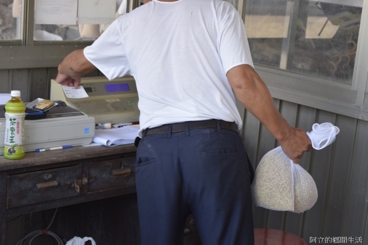 三哥的車先停到地磅上面過磅。 車子含稻穀總重是2060公斤,待會卸完稻穀再過磅一次,就知道卸下稻穀的重量了。 三哥到辦公室驗明身分,唯有符合資格的農民農會才會收購稻穀。農會人員爬上車舀了一勺穀子,要幹嘛呢? 把穀子放進容器檢驗。 再裝入紗網,取一張標籤紙。 把寫好的標籤紙放入袋子裡,工作人員熟練的往後一扔...我的視線還停留在那雙藍白拖上...。 哎呀!剛才三哥那袋穀子扔哪去了,好奇裡面寫了什麼?我趕忙跑過去找,有吊著的,地上也一堆,可是每一袋長得都一樣,只能從標籤分辨了。 終於找到三哥的姓名,原來這是105年1期作稻穀留樣,農會有這樣嚴謹的糧食品質管控機制,但是看到滿地的留樣堆疊,真要找哪一袋大概不容易吧! 接著把車往裡頭開,看到一個巨型的建物,好像就是穀倉,三哥叫我在這等一下。 有人開堆高機來了,咦!這不是三哥嗎?三哥你今天是一人分飾多角嗎?三哥說自己來比較快。農民果然多才多藝,什麼都自己來。 小哥把太空包的4個掛耳掛上堆高機,三哥把穀包升起吊離貨車。 穀包吊到鐵網上方,鐵網下方是穀倉的投入口。 太空包底下有玄機,可以鬆開袋底的繩子,小哥很小心的解開繩子,需要特別注意安全。 稻穀宣洩而下。 換彪哥的大卡車卸貨,自動升起的車斗,輕鬆把稻穀卸下。 小哥把旁邊的穀子掃進鐵網,不要浪費糧食。 兩輛貨車再過一次地磅,農會人員把稻穀總公斤數印成一張單據給三哥帶回,結束了今天的收割及繳糧工作。
