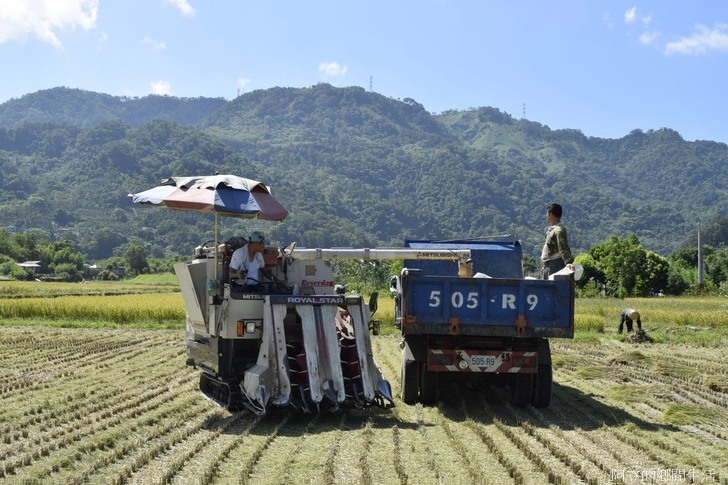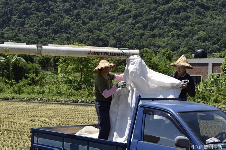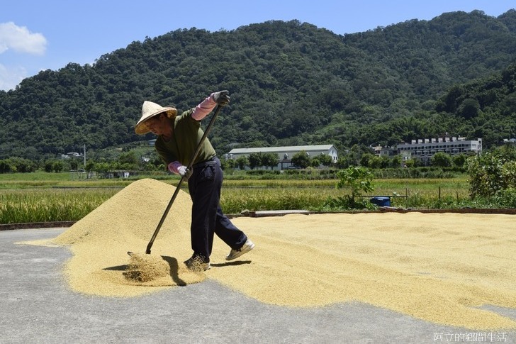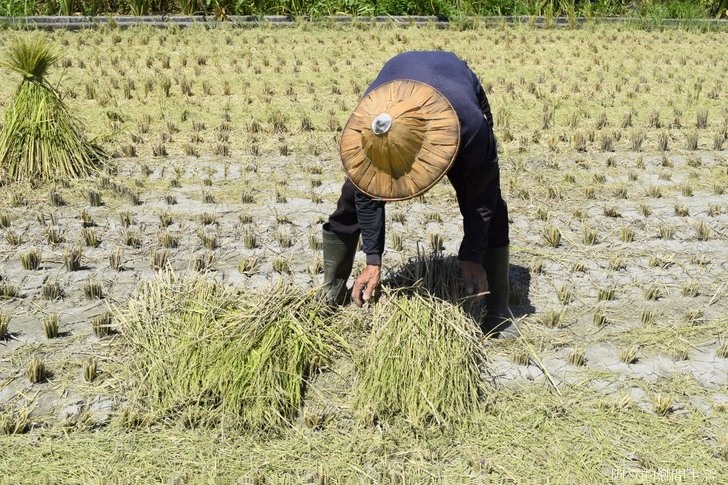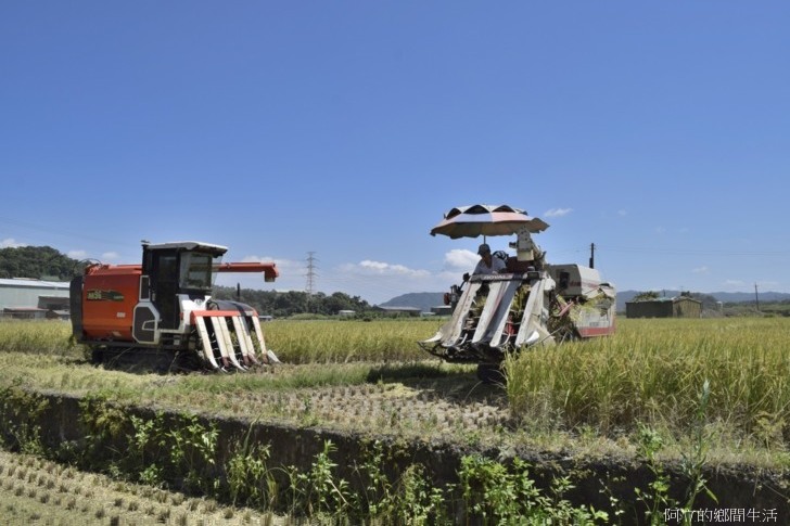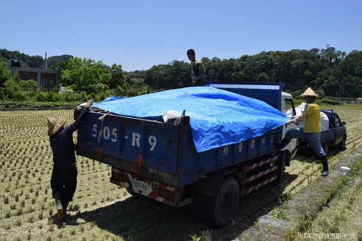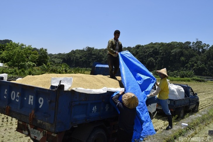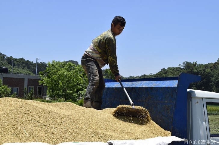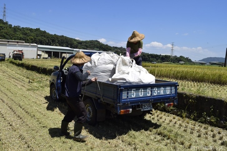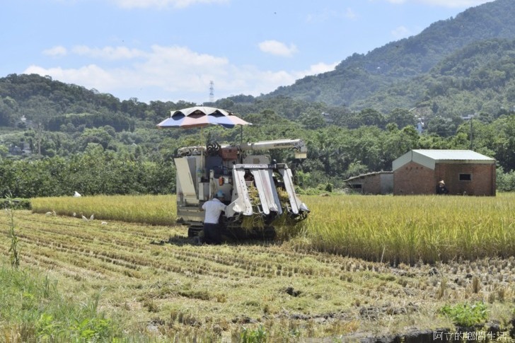 三哥今年3月22日春耕的一期稻作,經過114天的成長,已經結成金黃色飽滿的稻穗,可以收割了。 尼伯特颱風對新竹地區沒有造成災情,稻作品質及產量比去年還好,算是豐收年。 現在割稻簡單多了,有專門外包的收割團隊,通常開割稻機的是老板,配上一名助手,就能幫農民收割。小哥說他們幾年前也有自己的收割機,但是割稻時常常故障,萬一故障無法自行排除,又要叫修甚至待料,有收割機等於沒收割機,又得回到人工割稻,可是機器臨時出狀況人力又安排不足怎麼辦呢?搞得一個頭兩個大,乾脆花錢請專業收割團隊,省時省力。 老板開割稻機時,偶爾機器有狀況,下來幾分鐘便排除了。老闆有時停下來接電話,應該是客戶打來約定割稻時間,看老板忙得不亦樂乎,以前割稻所謂的農忙時期現在好像是指收割團隊的農忙,跟一般農民無關了。 割稻機經過之處,小蟲亂竄,這就是為什麼白鷺鷥等鳥類老是跟在割稻機後面的原因,因為能填飽肚子啊! 三哥留下一些稻草,熟練的紮成一綑,可以用在農作上,像是鋪在菜園保持土壤濕度或是防曬防寒,物盡其用不浪費。 割稻機先卸下部分穀子到曬穀場,這些是三哥家族成員的糧食,其餘的就要給農會收購。 二哥也來幫忙,把穀子鋪平,利用好天氣把穀子曬乾。 隔壁田的種稻面積不大,今天也請割稻機來割稻,乍看這兩部收割機沒多大差異,定睛一看差異可大了,我們割稻機的老板頂著36度高溫,雖加裝陽傘仍一頭是汗,隔壁田請的割稻機可是豪華冷氣車呀,門窗緊閉...,呵呵!難怪我們這老板臉色怪怪的,心裡可能悔恨早知道當初多加一點錢,也有冷氣享受啊! 割稻機把穀子跟稻稈分離後,將穀子卸到卡車上,準備運送到竹東農會農業倉庫,對大多數的農民來說,自產自銷並不容易,把稻穀賣給農會是最省事也最有保障的選擇。 今天的司機彪哥是三哥家族的成員,小時候也曾到這裡幫忙割稻。 運送到農會有一段路,彪哥、三哥、小哥用帆布蓋好,以免穀子沿路飛灑。 三哥自己的車也裝了兩個太空包,嘿嘿!今天有機會跟三哥到農會看怎麼收穀了。