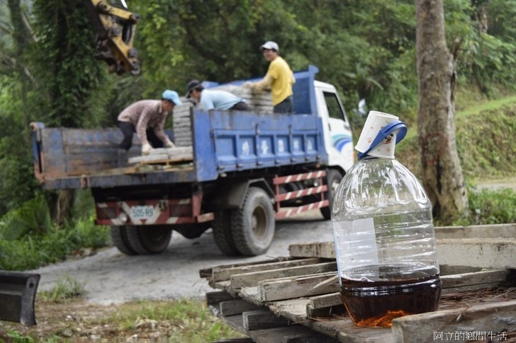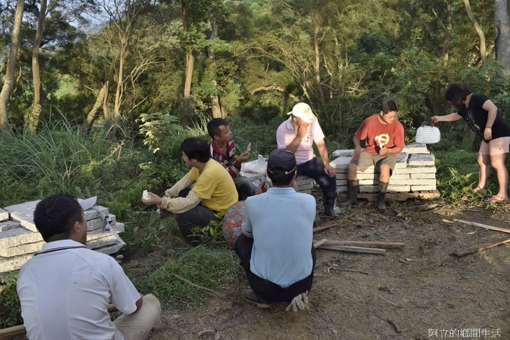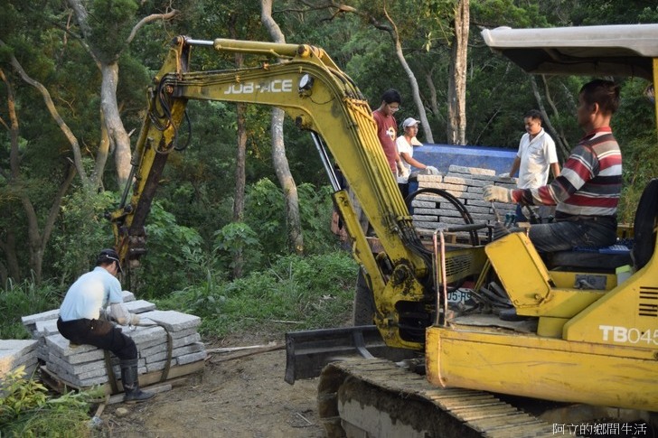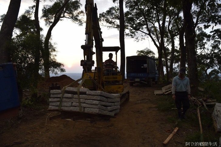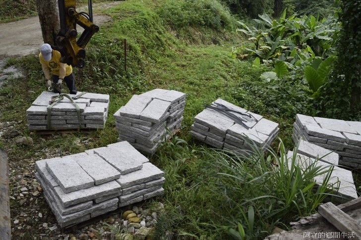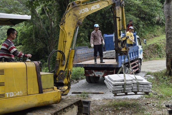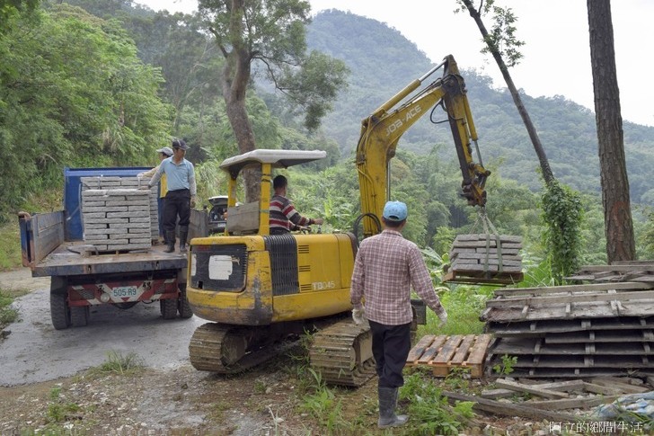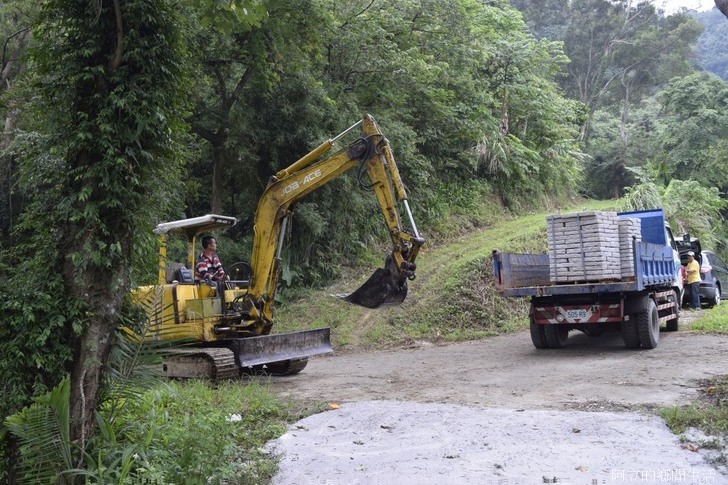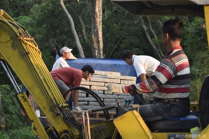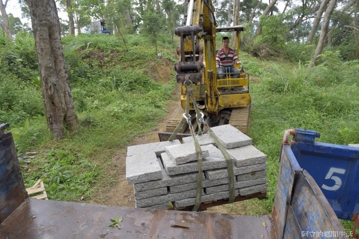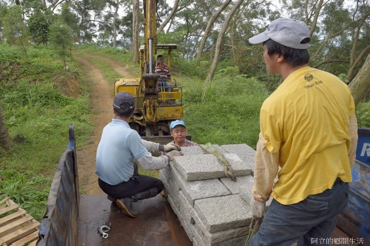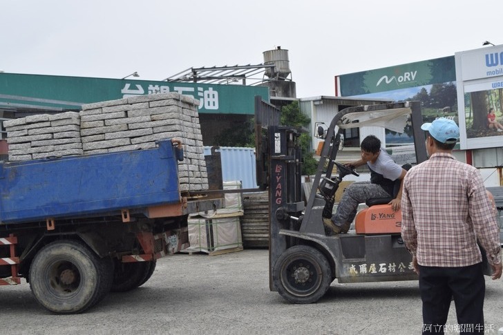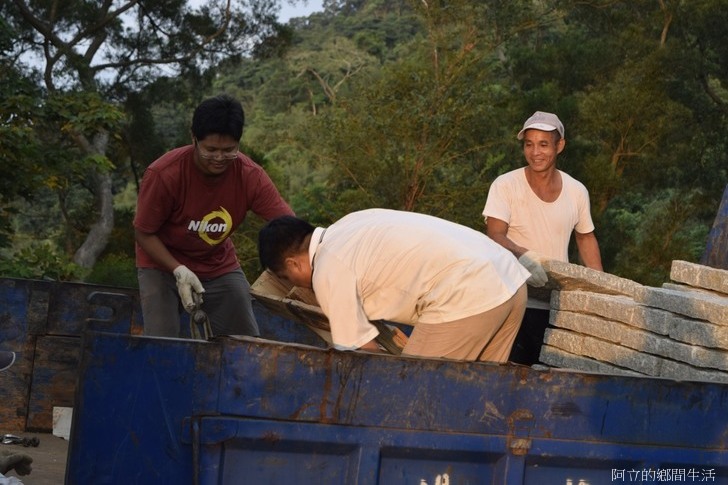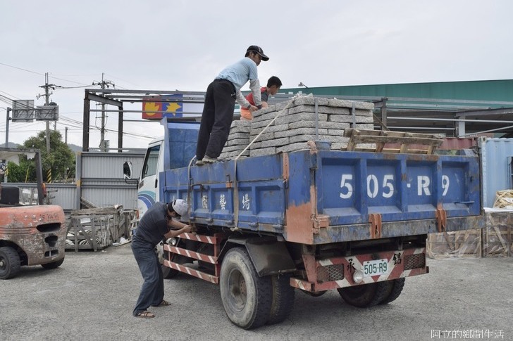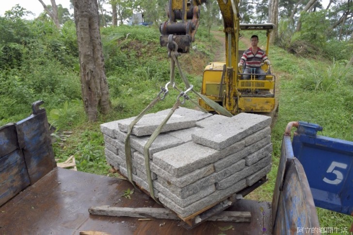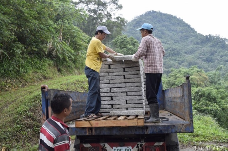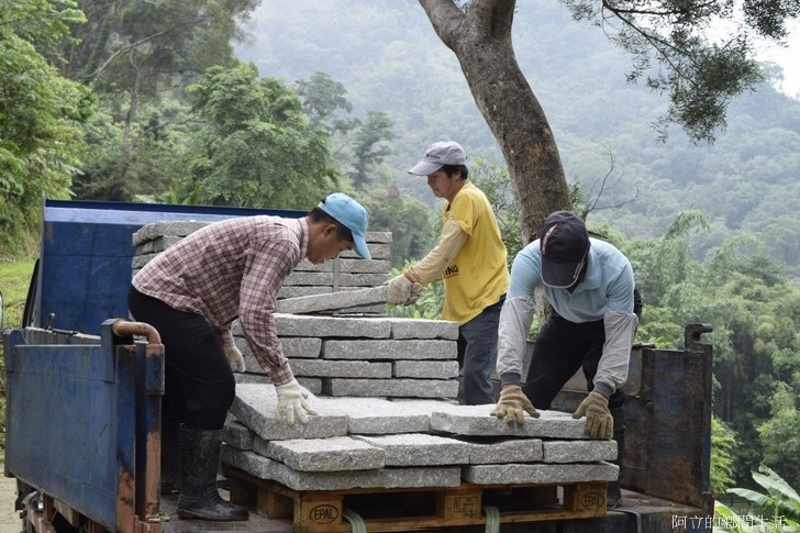 水保局景觀軸線的僱工購料計劃,打造北埔大湖新景點相思嶺景觀台,近期採購一批鋪設步道用的石板。 相思嶺位於上大湖高點,是大湖一片丘陵地裡難得的平台,顧名思義,相思嶺上相思樹成林,這裡的相思樹有個特色,都是向東彎著長大,原來是由西邊南寮吹來的海風,把當時正在成長的相思樹吹成風的線條,生長方向都偏向一邊。 石材廠的卡吊(卡車兼吊車)噸位體型太大,根本上不去相思嶺,怎麼辦呢?問展哥家的卡車可以幫忙載嗎?展哥對地方上的工作是義不容辭,只是擔心石板過重怎麼下車,我們沒有大吊車,只有怪手,怪手又無法吊太重的東西,可能部分要用人搬的...,沒關係,船到橋頭自然直啦!先載回來再說。 和展哥、阿安、小哥、璿璿來到石材廠。越南進口的石板,一個棧板有90片石板,一片石板重28公斤,一個棧板總重達2,520公斤。 石材廠用堆高機輕鬆把石板放上我們的卡車。我們自己人面面相覷,嘿嘿..!回去後石板下車應該沒那麼容易吧! 負責開車的阿安擔心上坡時石板往後滑動,用束繩把石板拉緊固定。小哥則預測了石板下車時會面臨的問題,請廠商提供空棧板,屆時太重要搬開些石板分攤重量用。 綁緊後,準備發車。 回到相思嶺,展哥把後門檔打開,阿安把束繩卸下,考驗才要開始。 展哥家今天出了3個人力,弟弟阿安開車,標哥開怪手。 怪手無法一次吊90片石板的重量,怪手先把裝滿石板的棧板往裡推以騰出空間,再放上空棧板。小哥和阿安把石板分一些到空棧板上,準備分次吊運。 一個滿載的棧板有90片石板,要分成30片一個棧板,表示要搬60片到其餘2個棧板,這次訂購6個棧板540片,表示要搬360片到空棧板,一片28公斤,總計要人工小搬運10,080公斤的石板,今天的工作可是場硬仗啊! 怪手開始試吊,不太順,棧板被重力壓出霹霹啪啪的斷裂聲,石板搖搖晃晃,險象環生,大家看到嘴巴不自覺張開,還好都平安落地。 雖然以前沒有吊運石板的經驗,雖然過程慢了點,不過還算順利。 早上10點第一車開始載運,2個棧板分成6個棧板,回到山上吊下車已經過了中午12點。 下午還要載2車呢! 下午由我隨車去載運石板,碰上突如其來的陣雨。 回程相思嶺路上,卡車較高,視野和平常看的也不同,大湖這片山林景色真不錯。 怎麼搬不完啊!休息時間到了嗎? 大家搬石板都累了,我這飼料雞也上車體驗,嗯!鍛練身體的確不錯。 終於下完第2趟石板。 聽說有救兵來了,已經在路上。 第3趟也是最終趟,載回來後,阿里、阿平、富斗哥及村長都來出力幫忙。 大家分工合作,接力搬運,這就是僱工購料的效益之一,社區居民凝聚力量,對這工程也格外有感情。 剛才說正在路上的救兵到了,其實救兵是小嫂啦!在忙得一身是汗,飢渴交迫之際,送來饅頭、冰棒,這才是真正的救星啊! 有人準備點心,稍微停歇,好像忘了剛剛汗如雨下的辛勞。 繼續加油趕工。 終於,下完最後一批石板,什麼?天都黑了。 順道欣賞相思嶺的夕陽之美,好像又再次忘了剛剛的辛勞。 以一張團體照結束今天的工作。大家臉上堆滿了笑,看似不累,只是回家後早早就寢,一覺就到天明。 |