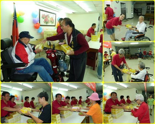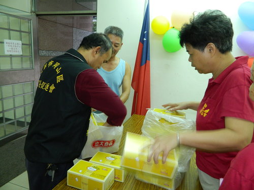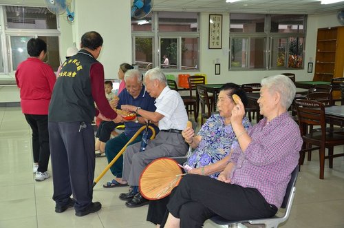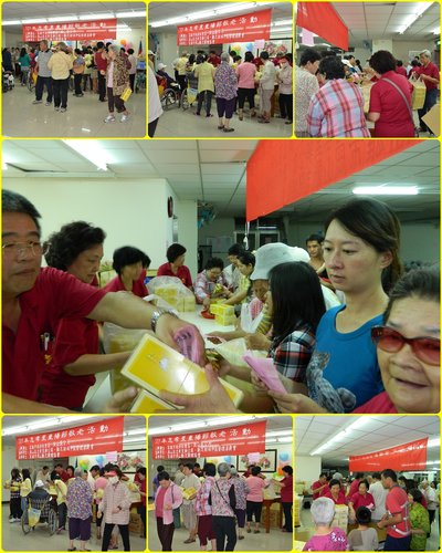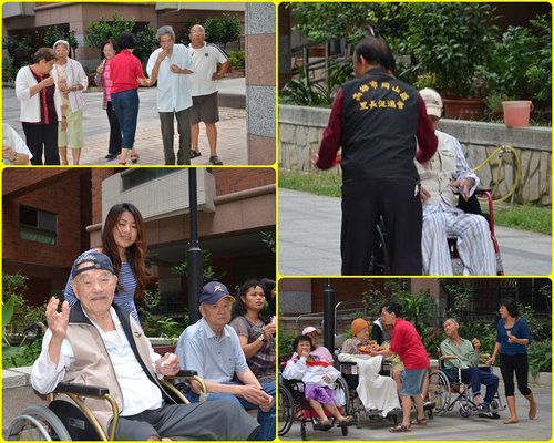 除了場內等候活動開始的長輩之外 庭院中也有不少的長輩坐著邊聊邊等待 志工們及里長當然也沒有忽視到 端著茶點請他們享用 共享敬老的快樂
