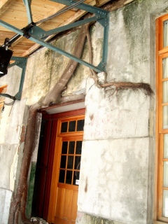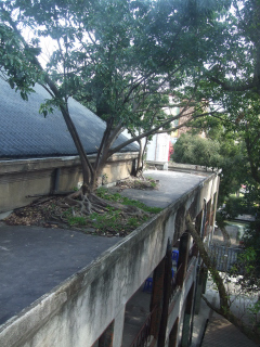 4月11日周六下午到華山創意文化園區參觀,朋友熱心擔任義務導覽,拎著一大串鑰匙,幫我打開一扇扇厚重的大門,一窺廠房內部的景觀. 這是我第一次到華山, 之前聽說那裏已成為台灣創意文化人聚集拚場的地方,但一直沒機會一睹真面目. 要不是懷著對古蹟的敬畏,對[老房子]的珍惜,相信一般人走進華山看到一棟棟老舊破朽的廠房,可能會嗤之以鼻.可是,老房子一旦有人文藝術加持,它就活了起來, 這也是我們台灣能夠拿出來跟世界比拚的東西---我們的人文素養和創意文化,就是我們的軟實力. 我拍了許多照片,其中一組很有意思,一棵樹竟然長在屋頂,從二樓陽台的水泥地裏冒出來,經過多少歲月,枝葉茂盛,而它的樹根,由於向地性使然,要尋找泥土,竟然穿過水泥屋頂,順著牆壁伸展到一樓,再順著門框,終於爬到地上. 有人推測,這榕樹當初可能是有小鳥把樹種叼到陽台,或者是延著水管生長,最後把水管撐爆. 至於是先有門還是先有樹根,可能要問當年這老酒廠工作的人才知. 榕樹的生命力極其旺盛,這棵樹是明證.我就給它取名[生命樹]吧. |