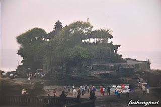 旅遊年代久遠,就由維基幫我介紹吧,哈哈: "海神廟位於塔巴南,距登巴薩(巴厘島省會)約20公里,蓋在一個經海水沖刷而形成的離岸大岩石上,在海水漲潮時,與其連接的通道會被淹沒,無法通行,必須等待退潮才能進入廟宇參觀。海神廟是巴厘島七座濱臨海岸廟宇的其中之一,每一座都在彼此視力可達範圍之內,形成一個西南岸的廟宇群。 海神廟據說是由15世紀時,一位來自爪哇島的印度教僧侶,名叫Danghyang Nirartha所建立。他在南部遊覽時,因看到這邊有塊岩石發出耀眼的光芒而決定在此休息。 Nirartha認為此地是個可祭拜海神的聖地,之後吩咐漁夫在岩石上蓋起這座廟。往後的幾世紀,海神廟成了巴厘神話的一部分, 據說在建造廟宇的時候,遇到了大風浪的侵襲,在岌岌可危之時,Nirartha便解開身上系的腰帶丟入海中,這個腰帶就變化成一條大海蛇保護廟宇不受侵襲。此外據說海神廟底座的海蝕洞裡會出現顏色黑白相間的海蛇守護此廟宇,防止惡靈和入侵者的騷擾。"