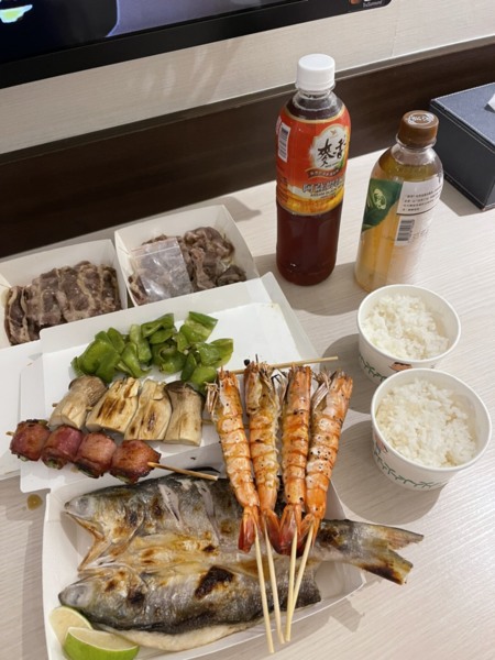 看著小六彬依然精神奕奕地上數學課,國文媽呆坐在床上已經頭昏眼花手腳發抖,趕緊吃洋芋片充飢……。好不容易上完課已經八點半,小六彬電量耗盡只想”吃吃睡”,飯店明明位於鬧區,此刻卻冷冷清清,店家也幾乎停止營業,母子倆只好走到附近日式食堂買了燒烤回房享用!(午仔魚、鹽烤牛五花、醬烤牛五花、培根蔥串、杏鮑菇、青椒、四隻大明蝦……果然又是高級燒烤,小六彬這吃貨幾乎不買路邊串烤,跟”他媽”一樣……)。心滿意足吃完燒烤,這孩子只剩呆萌眼縫看著網球賽,看著…看著……噓……這孩子睡了……。