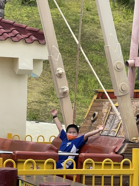 接著,我們到販賣部買了飲料,補充水分和糖分,稍作休息後我們就開始往山腰走,那裏只有開放海盜船,因為它是整個樂園裡面最刺激的設施,彷彿整艘船由左到右晃到90度垂直的感覺,每個上去玩的遊客都叫得好大聲,而我剛開始也怕怕的,但後來我發現這項設施其實既刺激又好玩,如果不是媽媽叫我,我還真捨不得離開。